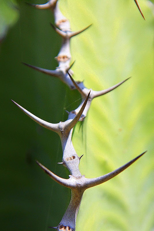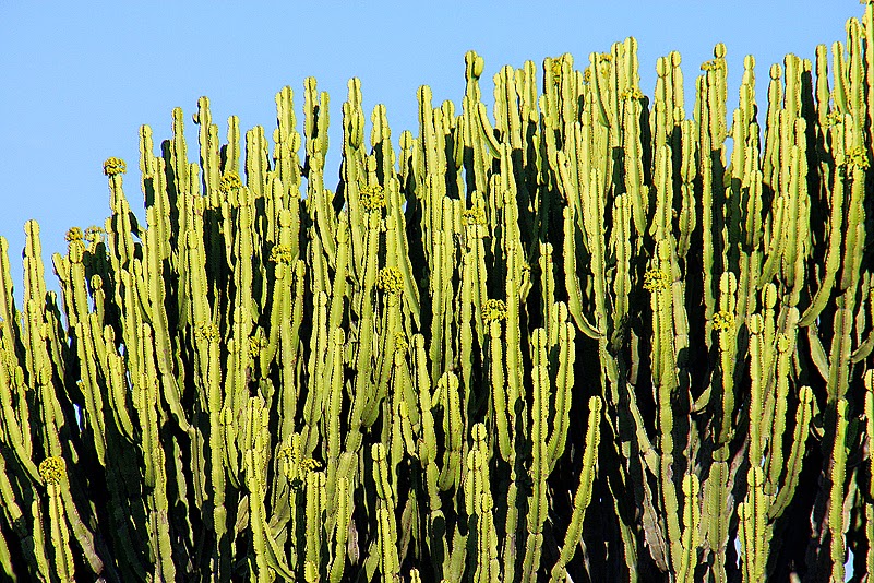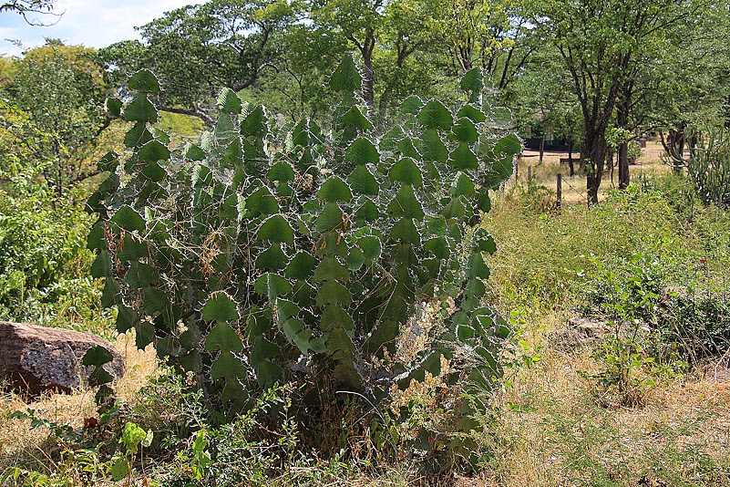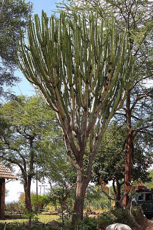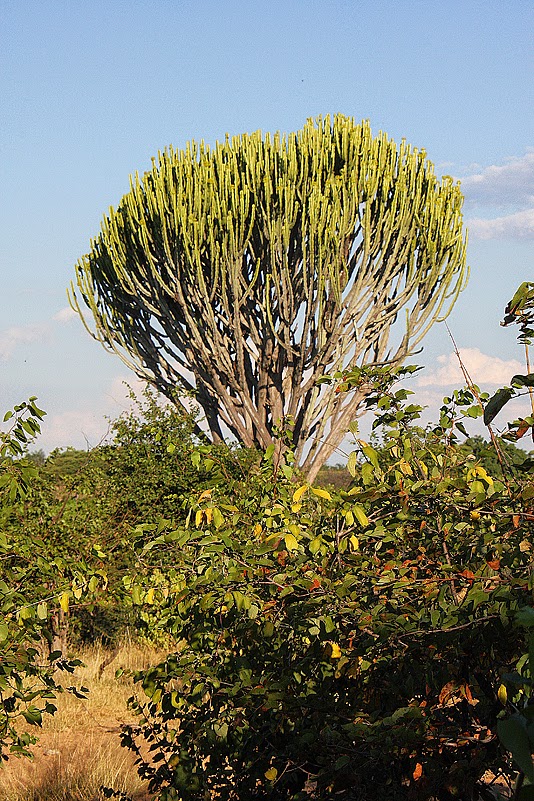 Nun sind wir also wieder alleine und fühlen einen gewissen Unternehmungsgeist. Es ist noch früh am Nachmittag und so beschließen wir, einen kleinen Ausflug zu unternehmen – herunter von dem traumhaften Plateau, hinab in die Ebene, die wir gerne mal von Nahem inspizieren würden. Schnell ist der restliche Kaffee ausgetrunken, das Nötigste ins Auto gepackt und wir können los. Langsam tuckern wir die rund 60 Höhenmeter nach unten und nehmen Kurs auf Mandavu Dam, die nächstgelegene, nennenswerte Wasseransammlung. Dabei durchqueren wir dichtes Buschland, das zwar wenig Sicht auf eventuell vorhandenes Großwild zulässt, dafür aber ziemlich spannend ist, was Pflanzen und kleinere Tiere betrifft. Bereits auf den ersten Kilometern beeindrucken uns große Baumeuphorbien, die ihre grünen, kakteenähnlichen Zweige wie hundertarmige Kandelaber gen Himmel recken. Sie blühen gerade. Das allerdings kann man eher hören als sehen: die Blüten der stattlichen Wolfsmilchgewächse sind so unscheinbar, so winzig und so hoch droben, dass man sie mit bloßem Auge kaum erkennen kann. Dafür aber sind an diesen Nektarquellen zahlreiche Insekten zugange – und die sind unüberhörbar! Heinz, der eine besondere Vorliebe für hochwachsende Sukkulenten hat – seien es Säulenkakteen oder eben solche Riesen – ist ganz verzückt. Ich hingegen erfreue mich mehr an diversen Kleingewächsen am Rande der Botanik. Diese Blüten, Ranken, Blätter! Winzige grüne Greifärmchen, die zielstrebig nach Halt suchen, warzig-drüsiges und haariges Grün contra lackglänzendes Laub, Staubgefäße in der Größe eines Flohpopos, andere aufgefächert wie kitschige, in den Siebzigerjahren so beliebte Glasfaserlampen in Gamsbartform. So viele Farben und Formen, so viel Schönheit, selbst im ganz Kleinen!