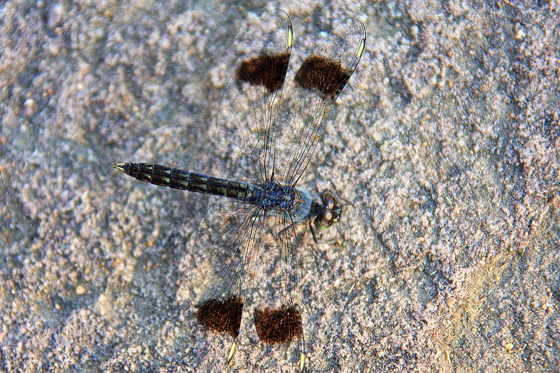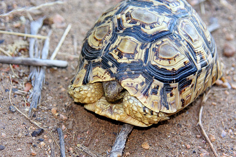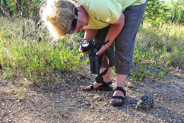 So hat halt jeder von uns seine eigenen Vorlieben und Marotten, die sicher alle ihre Berechtigung haben. Heinz ergeht sich also voller Freude in seinen Baumeuphorbien, ich schwelge in bekanntem Unbekanntem – und unsere beiden Freunde warten auf Tiere. Und wenn’s „nur“ Schildkröten sind… Aber auch solche kreuzen unseren Weg! Allseits zufrieden erreichen wir schließlich Mandavu Dam, wo wir, vor der Rückkehr nach Sinamatella, eine ausgiebige Pause einlegen. Ein malerischer Platz tut sich mit Camp Mandavu vor uns auf: eine kleine, aber deutliche Wasserfläche, bethront von einem oberhalb des Staudamms liegenden Camp-Areal, mit einer Aussichtsterrasse direkt am kleinen See. Ein wunderschöner Ort, den wir uns sofort, sollten wir wieder mal in den Hwange NP kommen, als Übernachtungsplatz vormerken. Heute allerdings sind wir nur auf einen Kurzbesuch hier, doch auch den genießen wir in vollen Zügen, denn es gibt viel zu sehen. Am Rande des Stausees tummeln sich Reiher und Kraniche, aus dem Geäst der das Camp beschattenden Bäumen beäugen uns neugierige Drongos und Glanzstare, Eidechsen huschen über die warmen Felsen der Aussichtsterrasse und zahlreiche Libellen schwirren wie bunte Pfeile dicht über den Boden.