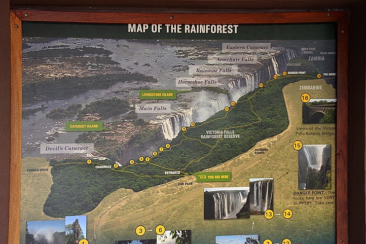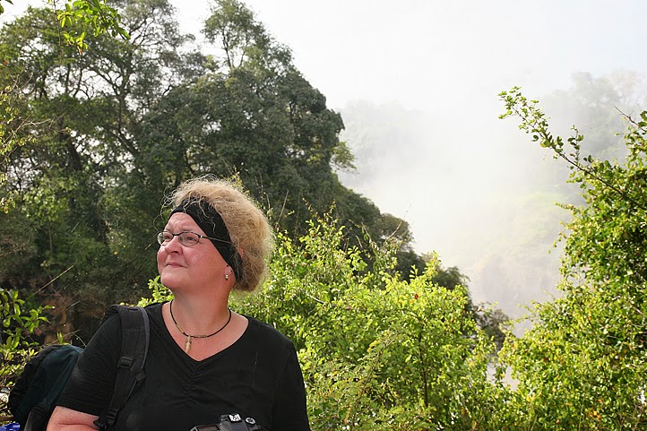 Die Zeit verschwindet in der Gischt, in dieser Zauberwelt. Wir können deshalb auch nicht sagen, wie viele Sekunden, Minuten oder gar Stunden seit unserer Ankunft am Gate vergangen sind. Und wäre da nicht diese begrenzende Balustrade, die uns am Weitergehen hindert, so würden wir wahrscheinlich noch weitere Sekunden, Minuten, Stunden hier zubringen. Die hölzerne Sperre aber dirigiert uns wieder zurück. Pitschnass und ohne auch nur einen anderen Touristen gesehen zu haben, erreichen wir irgendwann erneut trockenere Gefilde. Mit der zunehmenden Trockenheit gewinnt die Luft am Wärme, der Park füllt sich mehr und mehr mit Menschen. Die meisten sind geschockt von dem Bild zweier getaufter Mäuse, das Heinz und ich abgeben: „Whooo, quite wet out there, isn’t it?!“ „Ja, richtig nass, Leute – aber so schön!“ Doch wir können das Erlebnis dieser Mega-Dusche wohl nicht in ausreichendem Maße preisen, denn fast alle Besucher, die uns auf dem vergleichsweise trockenen Rückweg zum Gate begegnen, lassen sich von unserer Durchnässtheit ins Bockshorn jagen und begnügen sich damit, die Fälle gehört zu haben. Zu nass, nö, nö, nö, das brauchen wir nicht – schon sind sie wieder weg. Tja, da hat das Zimbabwean Tourism Board wohl noch einiges zu tun! P { margin-bottom: 0.21cm; }Das Land ist mit dem größeren Teil der Fälle gesegnet, doch trotzdem gibt es hier keine Regenmäntel zu leihen: der willige Tourist auf zimbabwischer Seite führt also derlei Ausrüstung entweder selbst mit sich oder er erwirbt einen Regenschutz auf dem Souvenirmarkt. Der aber liegt deutlich jenseits des Gates, dort, wo eine derartige Nässe recht unwirklich, ja beinahe unvorstellbar erscheint. Ist man jedoch im Nationalpark erst mal drin, kommt man zwar wieder raus, nicht aber wieder rein – zumindest nicht, ohne erneut den Eintritt zu bezahlen. Das ist, gelinde gesagt, ungeschickt. Gut, wir befinden uns in der Nebensaison, in der ohnehin wenig Touris unterwegs sind und ich bin schon so lange nicht mehr in Zimbabwe gewesen, dass ich meine Hand nicht dafür ins Feuer legen möchte – eventuell gibt es in der Hauptsaison ja doch einen Regenmantelverleih… Doch das, was Heinz und ich auf unserem Rückweg ins Trockene erleben und erst recht das, was uns auf dem Souvenirmarkt widerfährt, gibt meiner Vermutung recht.