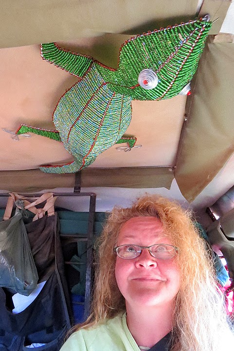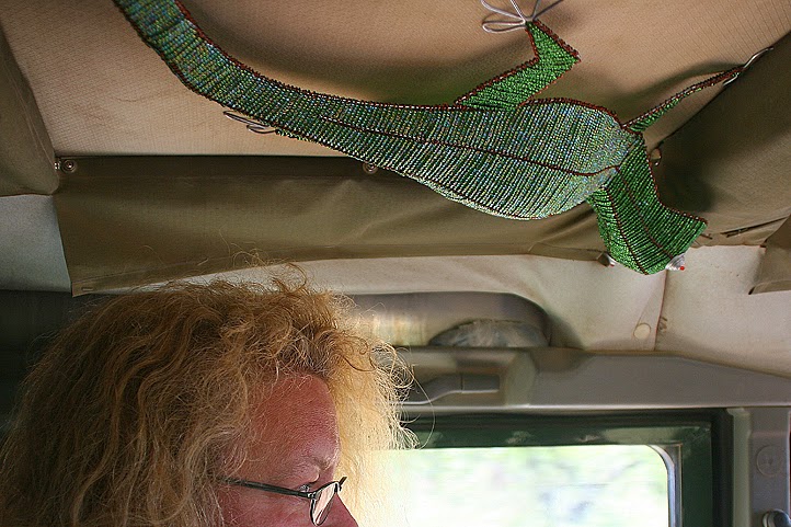 Tja, gute Wünsche sind genau das, was ich jetzt ehrlich brauchen kann, besser noch – einen guten Rat… Aber der ist im Moment teuer, denn mein gestern so wurstig von mir geschobenes Transportproblem holt mich soeben volle Breitseite ein. Wohin mit Lurchi? Ich kann ihn doch nicht die nächsten Tage über ständig im Arm halten! Er ist zwar recht stabil, aber auch viel zu kostbar, um ihn in den schwer bepackten Laderaum zu stopfen. Für den Fußraum ist er definitiv zu groß, in die Mitte der Rückbank passt er erst recht nicht und hinter uns ist auch kein Platz. Verzweifelt lasse ich meinen Blick durchs Wageninnere schweifen – und bleibe an der canvasbespannten Safariluke über mir hängen. Das könnte gehen! Mit List und Tücke, mit etwas Gedrücke und Gezerre, bekomme ich das stattliche Perlentier tatsächlich dort verstaut, direkt über meinem Kopf, bombenfest! Der Schwanz klemmt nun im hinteren linken Eck, das rechte Vorderfüßchen schräg gegenüber und der Kopf ragt luftig darüber hinaus. Als wären die Luke und Lurchi füreinander gemacht!