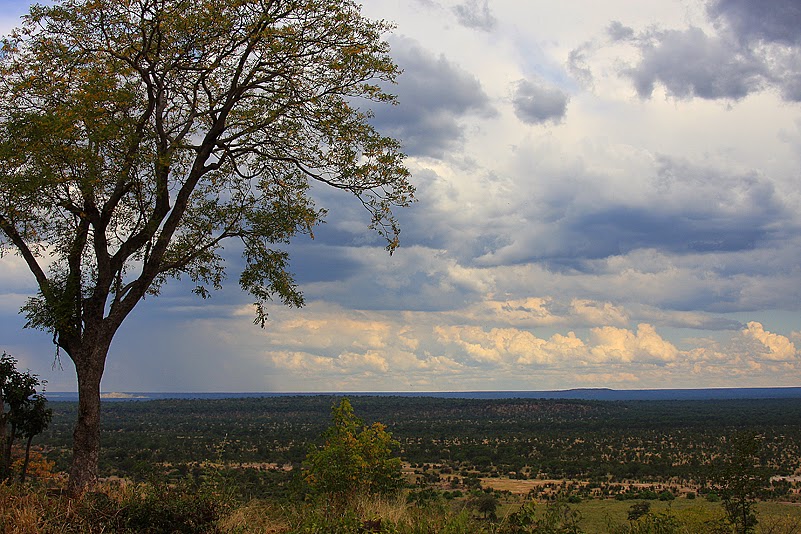 Wir befinden uns auf einem weitläufigen Plateau, das an seinen Rändern steil abfällt – hinab auf eine baumbestandene Ebene, die sich in alle Himmelsrichtungen erstreckt, soweit das Auge reicht. Von hier oben blickt man auf kleine, blinkende Wasserflächen, deutlich sichtbare Tierpfade, eine Fläche, die in unterschiedlichen Grün-, Gelb- und Brauntönen schimmert, wogende Bäume, die markanten Silhouetten riesiger Baumeuphorbien und einen leuchtend blauen Himmel, der durch die umherziehenden Schäfchenwolken noch unendlicher erscheint, als er ohnehin schon ist. Ein geradezu zauberhafter Ort! Wir brauchen eine ganze, eine ziemlich lange Weile, bis wir uns in diesem umwerfenden Panorama eingefunden haben. Dann erst haben wir auch Augen für die anderen Dinge, die uns hier umgeben: schäbige Bungalows, abblätternde Farbe, rostende Gitter, bröckelnder Beton. Überall ist ein deutlicher Verfall zu sehen. Doch trotz aller Schäbigkeit regiert hier gleichzeitig eine sichtlich um Sauberkeit und Behaglichkeit bemühte Hand – jemand, der uns herzlich willkommen heißt und sichtlich um unser touristisches Wohlgefühl bemüht ist. Das kann man ganz deutlich spüren. Nichtsdestotrotz macht sich in uns eine recht seltsame Stimmung breit: diese fast greifbare Herzlichkeit, gepaart mit der maroden Ausstrahlung des Platzes und dem unglaublichen Panorama – das hat etwas immens Anrührendes, etwas sehr Ergreifendes und gleichzeitig Unwirkliches. Wir alle fühlen es, doch keiner von uns kann es richtig in Worte fassen.