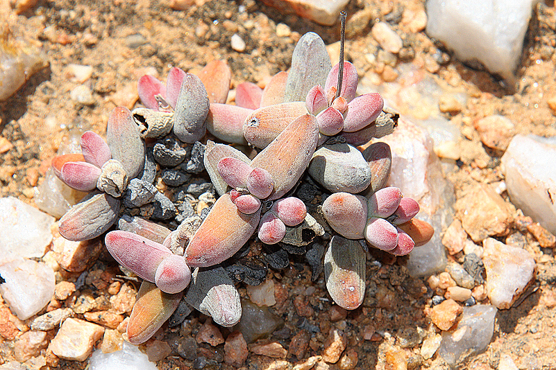 Heinz hingegen fühlt sich erstaunlicherweise immer noch topfit und würde mit Sicherheit gerne noch den einen oder anderen Hügel erklettern, begleitet mich aber langsam nach unten. Die Betonung liegt auf „langsam“, denn so alle bin ich noch nicht, dass ich nicht immer noch Freude empfinden würde, wenn ein besonderes Gewächs zu sehen ist. Und da gibt es viele… So also schrauben wir uns ganz allmählich nach unten, Schritt für Schritt, immer schön aufpassend, um nur ja keine Pflanze zu übersehen und auch, um nicht über meine eigenen Füße zu fallen. Am Auto angekommen, sinke ich ermattet in den schmalen Mittagsschatten und litere mir eine Flasche lauwarmes Wasser auf ex rein. Es zischt fast hörbar, dauert aber annähernd eine halbe Stunde, bis ich wieder einigermaßen brauchbar bin. Das war wohl „just in time“ – in zweierlei Hinsicht. Denn nicht nur mein Kreislauf war offensichtlich kurz vor knapp, sondern auch unsere Mitreisenden: die Reifen waren bei unserer Rückkehr schon länger wieder prall gefüllt und eine gewisse Ungeduld machte sich daraufhin breit, wurde jedoch unterdrückt, um uns die Quarzhügel, wie versprochen, gebührlich genießen zu lassen. Zur Kompensation dieser lästigen Wartezeit wurde wohl kurzerhand ein Mittagssnack ausgepackt, dessen letzter Bissen gerade geschluckt wird, als ich mich wieder in der Lage sehe, aufzustehen und aus dem Schatten des Autos – und meinem eigenen – zu treten.