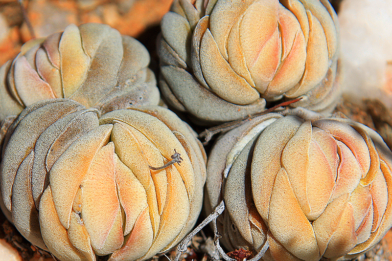 Was vor achtzehn Monaten noch unscheinbar, verschrumpelt und meist ziemlich unansehnlich gewesen war, strotzt heute vor Saft und Kraft, erstrahlt in den schönsten Farben, zeigt junge Triebe und Blätter. Und hin und wieder entdecken wir sogar ein Gewächs, das sich auf unserer letzten Tour vor uns versteckt hatte – nahezu unsichtbar unter der Boden-Oberfläche verborgen, in der beginnenden Winterruhe. Voller Freude umrunden wir den Hügel in immer enger werdenden Spiralen und delektieren uns an der immensen Vielfalt, die auf so engem Raum gedeiht. Heinz’ Blick schweift dabei immer wieder sehnsüchtig zu den benachbarten Quarzkuppen, denn die hatten wir uns ja ebenfalls zur Erkundung vorgemerkt. Meine anfangs ebenfalls noch vorhandene Sehnsucht jedoch beginnt nach eineinhalb Stunden des Botanisierens in glühender Hitze zu bröckeln, ganz allmählich, dafür aber umso deutlicher: mich schwummert. Obwohl wir uns nur etwa dreißig Höhenmeter über der Fahrspur befinden, so ist es hier viel windiger und gleißender. Die Hitze greift nach mir, ein Wind, der nicht kühlt, fönt mich pergamentig und raubt mir alle Kraft, meine Augen wollen nicht mehr scharfstellen, weil sie trocken sind, brennen und sich gegen das von den Quarzsteinen reflektierte Sonnenlicht wehren. Ich habe das Gefühl, ausgesaugt zu werden und gleich umzukippen. Aber ich Depp bin ja selbst schuld: ich habe keinen Hut auf und sträflicherweise auch kein Wasser mitgenommen. Kein Wunder also, dass mein Kreislauf nicht gerade mit dem Pudelwohl-Modus zu reagieren gewillt ist. Da hilft nur eines – ich muss in den Schatten und erst mal Wasser tanken!