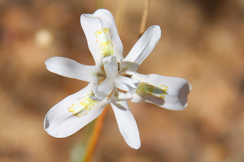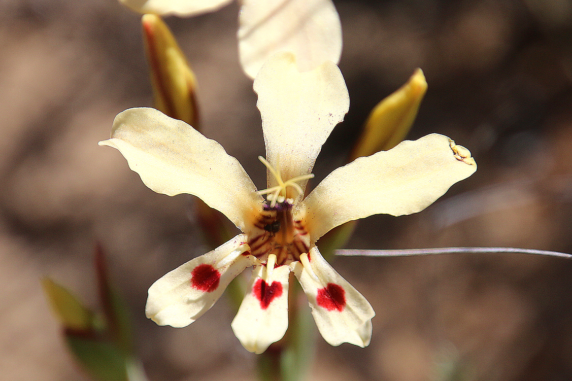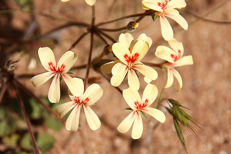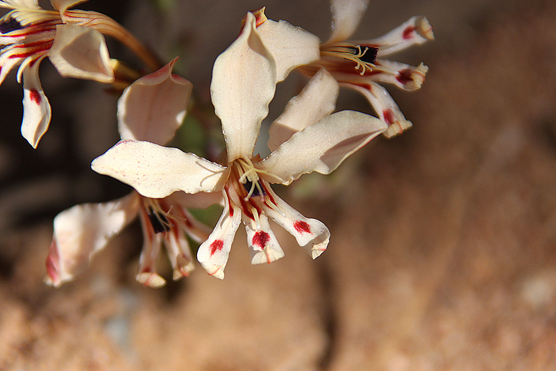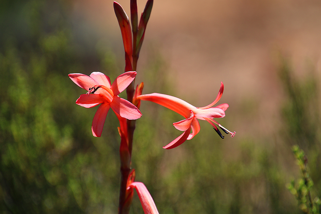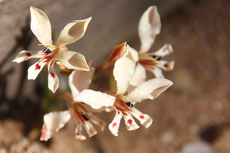 Und heute, bei vollem Tageslicht, darf ich feststellen, dass es noch viel mehr zu entdecken gibt, als ich gestern erahnt hatte! Zarte Moraeas, fragile Lyperias, keck-bunte Pelargonien, stachelige Acanthusgewächse, üppig blühendes Buschwerk und, ja, sogar Kostbarkeiten wie eine (nicht blühende) Aasblume und knallrot-samtige Hyobanchen sind dabei – und das alles in unmittelbarer Umgebung unseres Bungalows! Das empfinde ich als ganz besonderes Geschenk – den Komfort des nahen Heims, gepaart mit dieser so speziellen Flora. Und ich nutze beides gleichermaßen: aufgrund der bereits wieder spürbaren, bulligen Hitze suche ich zwischendrin öfter den Schatten unserer Veranda auf, schlage etwas Gesehenes in einem unserer zahlreichen Bücher nach, gönne mir einen Schluck Wasser und trabe dann erneut los – ohne dauernd etwas mit mir rumschleppen zu müssen. Was für ein Luxus!