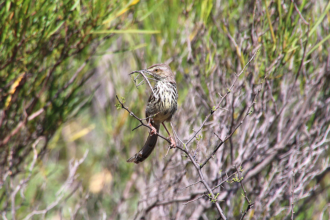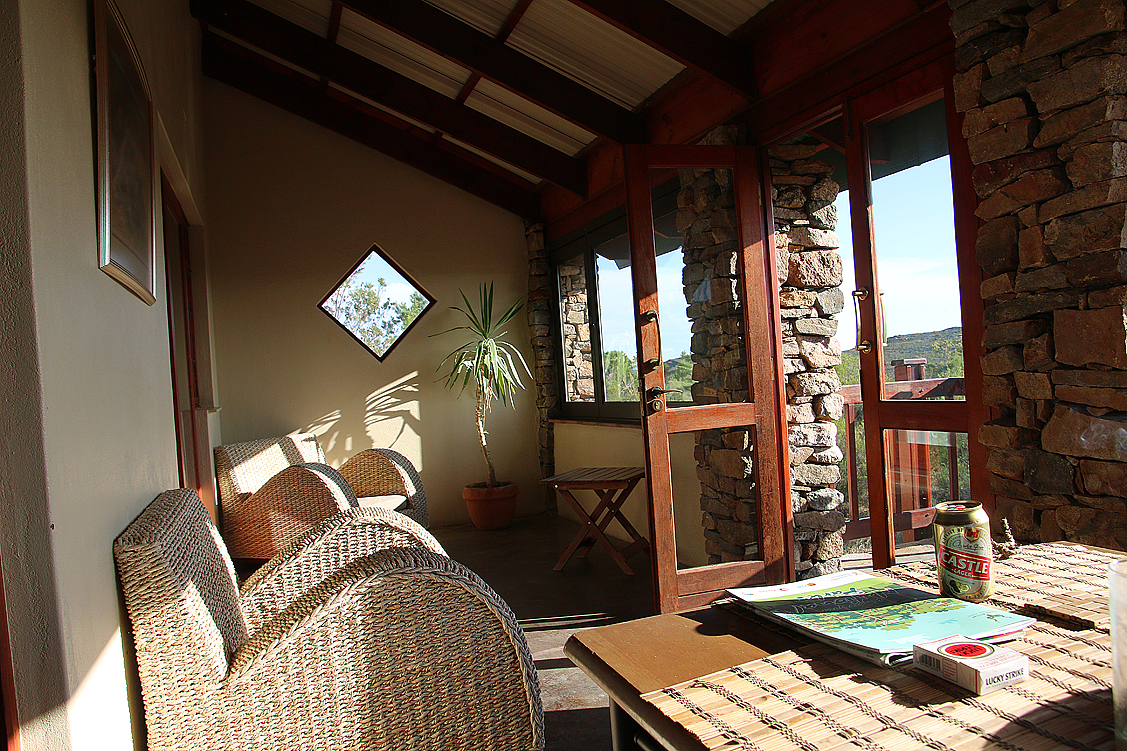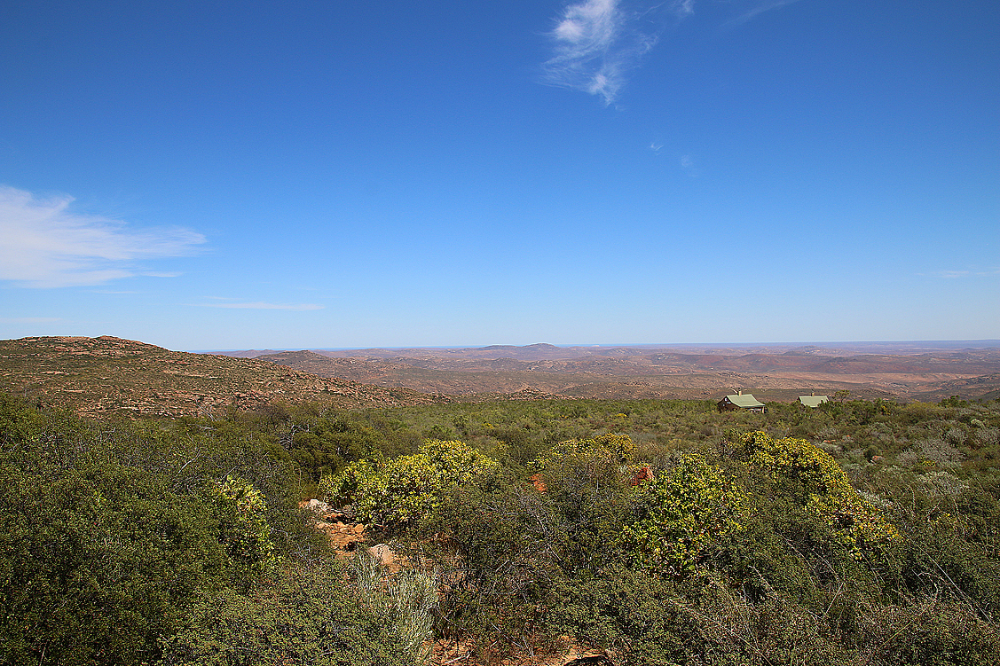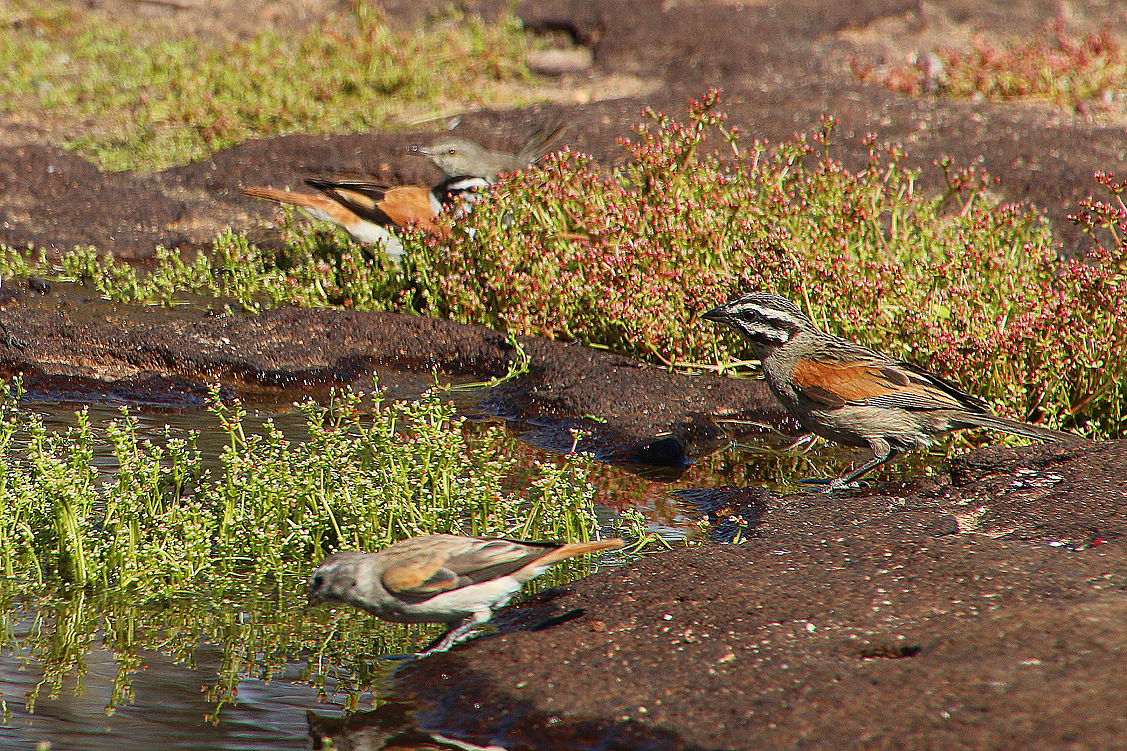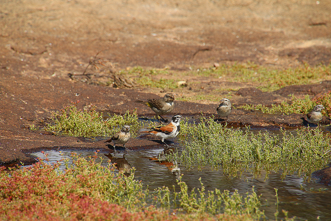 Das sind Erkenntnisse, die mich total faszinieren und immer wieder in die Mitte meiner eigenen Existenz rücken – ich bin ein winziger Teil des großen Ganzen, habe viel zu wenig Ahnung, was um mich herum wirklich passiert, bin aber so dankbar dafür, mich dergestalt einnorden zu können – und mich klein fühlen zu dürfen. Geplättet vom Informationszuwachs des heutigen, „untätigen“ Tages, sitze ich nun gerade in einem Korbsessel unserer verglasten Veranda, als Heinz plötzlich von seiner Exkursion wiederkehrt. Und er ist nicht weniger entzückt über den heutigen Tag als ich! In nördlicher Richtung oberhalb unseres Bungalows hatte er eine kleine Quelle entdeckt, an der sich zahlreiche Vögel tummelten und diese ausgiebig beobachtet. Begeistert zeigt er mir seine Fotos – lauter kleine, graubraune Vögel! Während ich mich also mit meinem „Lieblings-Spezialgebiet“ Asteraceae herumgeschlagen hatte, beobachtete Heinz das ornithologische Pendant dazu – mit dem einen Unterschied: er kennt sich mit den Graubraunen richtig gut aus! Ohne Zögern identifizierte er bei dem Vogelgewurl an der Quelle sofort zwei Girlitzarten, Kapbülbüls, ein paar Brillenvögel und eine Lerche. Mhm, bis auf die Bülbüls, die durch ihren Augenring unverkennbar sind, sehen die anderen für mich eben nur klein und graubraun aus. Aber auch das werde ich irgendwann noch lernen – vielleicht…