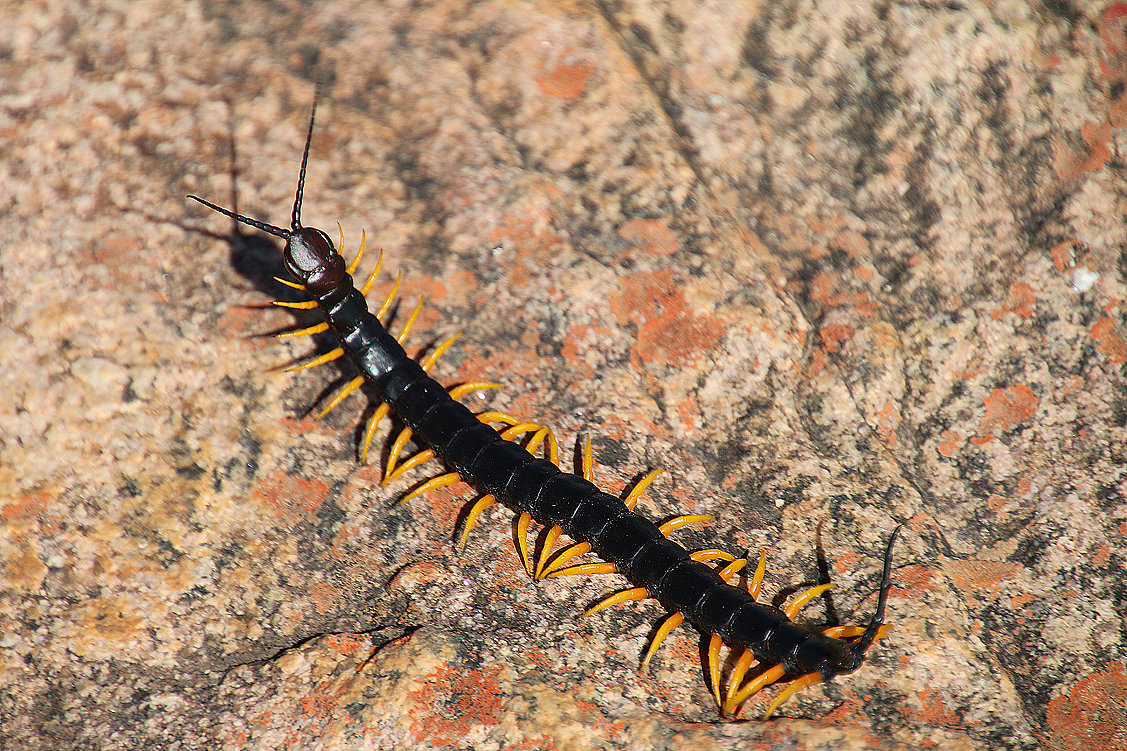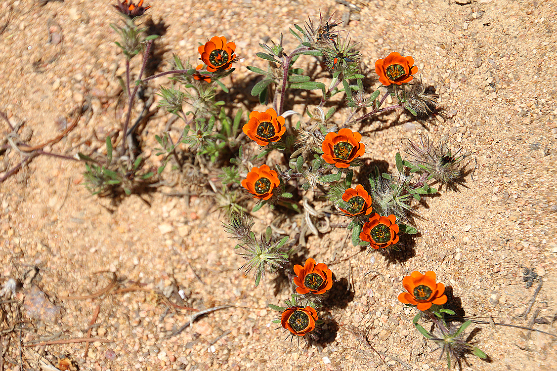 Zufrieden hieve ich mich aus dem gemütlichen Korbsessel unseres Wintergartens und schwärme erneut aus, um noch mehr zu entdecken; diesmal jedoch in südöstlicher Richtung statt der bisher Nordwestlichen. Und kaum bin ich ein paar hundert Meter hügelan gestiegen, springt mich schon wieder etwas an, diesmal aber wesentlich bodennäher als der hochgewachsene Salbei: es ist ein Asterngewächs mit knallorangen Blütenblättern auffälliger Zeichnung, die sich um ein dunkelbraunes Körbchen radial auffächern. Och neee, ein Asterngewächs, ein richtig plakatives noch dazu… Damit habe ich ganz besondere Identifikationsprobleme (wie mit den unscheinbaren, graubraunen kleinen Vögeln) – Dimorphotheka, Ursinia, Gazania, Gorteria, Arctotheca und Konsorten; ich werd’ noch irre! Aber hier habe ich etwas vor mir, was besonders rätselhaft aussieht: aus einigen, augenscheinlich artgleichen Pflanzen wachsen Blüten, deren Blütenblätter extrem unterschiedlich aussehen. Die meisten präsentieren sich in einem prägnanten Müllmann-Orange und haben da, wo sie aus dem schokoladenfarbenen Körbchen sprießen, zumindest einen oder auch mehrere gezackte, ebenfalls schokobraune Flecken, anderen Blütenblättern hingegen fehlt dieses Merkmal gänzlich. Eine Blüte aber ist dabei, welche ganz besonders auffällig ist und deshalb meine spezielle Aufmerksamkeit erregt: auch sie hat knallorange Blütenblätter und ein dunkelbraunes Körbchen, doch dort, wo das eine aus dem anderen wächst, tut sich etwas Seltsames. Es sieht aus wie ein zusätzlich aufsitzendes, dunkelbraun glänzendes Lackplättchen, pro Blütenblatt genau eines, und es verändert den „Look“ der Blüte komplett. Mit einem zahnstochergroßen Zweig lupfe ich eines dieser Lackplättchen – und sehe darunter genau das, was die anderen Blüten zeigen – nämlich samtig-braune Flecken oder eben blankes Orange. Woah, was ist das jetzt wieder? Aber ich komme der Sache auf die Spur: Es handelt sich um eine Gorteria diffusa (Nomen est omen) und diese wird unter anderem von einer Hummelfliege des schönen Namens Megapalpus nitidus bestäubt – die, man höre, den aufsitzenden Lackplättchen verblüffend ähnlich sieht! Eine Studie hat bewiesen, dass männliche Megapalpus-Fliegen geradezu magisch von diesen zusätzlichen Gorteria-Flecken angezogen werden. Als man diese Plättchen nämlich entfernte, gingen die Besuche der Wollschweber signifikant zurück.