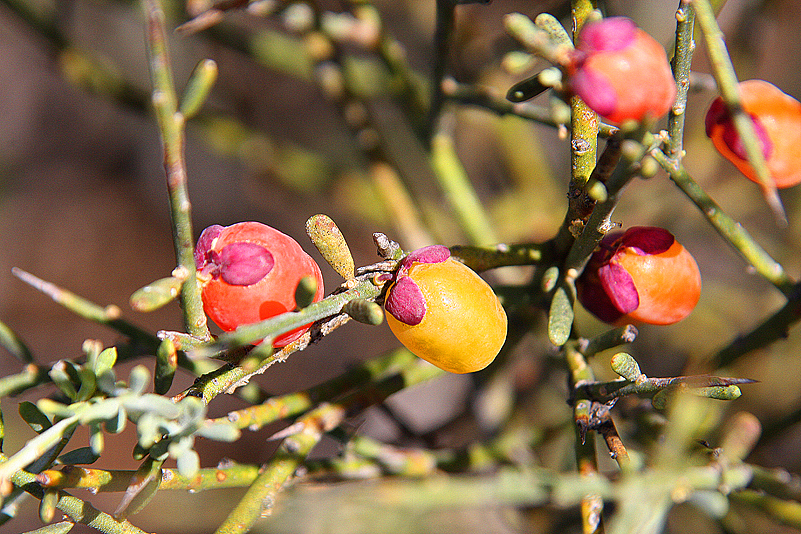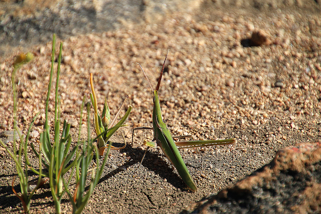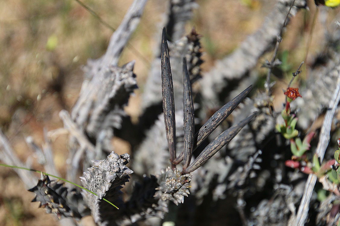 Luxus ist auch, dass ich, obwohl ich mich niemals recht viel weiter als einen halben Kilometer von unserer Behausung entferne, sogar in diesem begrenzten Umfeld wieder einige mir noch unbekannte beziehungsweise bis dato nie gesehene Pflanzen entdecke und erneut viel dazulerne. Zum Beispiel, dass es sich bei der wunderschönen Hyobanche aus der Familie der Sommerwurzgewächse (Orobanchaceae) um einen Vollparasiten handelt, dem jegliche Fähigkeit zur Photosynthese abhanden gekommen ist. Solche Holoparasiten dringen mit speziellen Saugorganen in die Leiterbahnen ihrer Wirtspflanzen ein und versorgen sich so mit allem, was sie zum Leben brauchen. Bequemes Leben! Allerdings sind die meisten Vollparasiten streng wirtsspezifisch, das heißt, sie können nur von einer ganz bestimmten Pflanze leben und, sollte hier ein Mangel bestehen, nicht auf ein anderes, verwandtes oder gar nicht-verwandtes Gewächs ausweichen. Wer im Falle meiner Hyobanche allerdings genau der arme Wirt ist, kann ich leider nicht feststellen, denn diese Parasiten docken unterirdisch an, schieben meterlange Rhizome und treiben ihren Blütenstand dann fernab der angezapften Wirtspflanze. Doch zu buddeln fange ich bei der Hitze sicher nicht an…