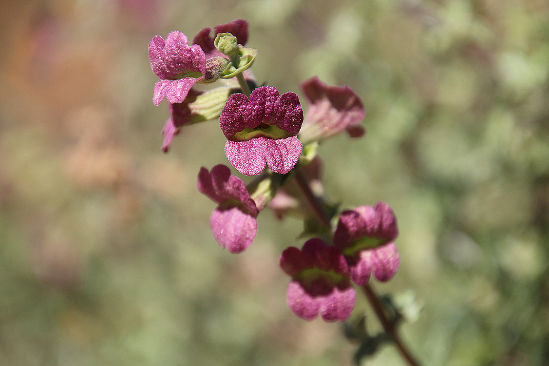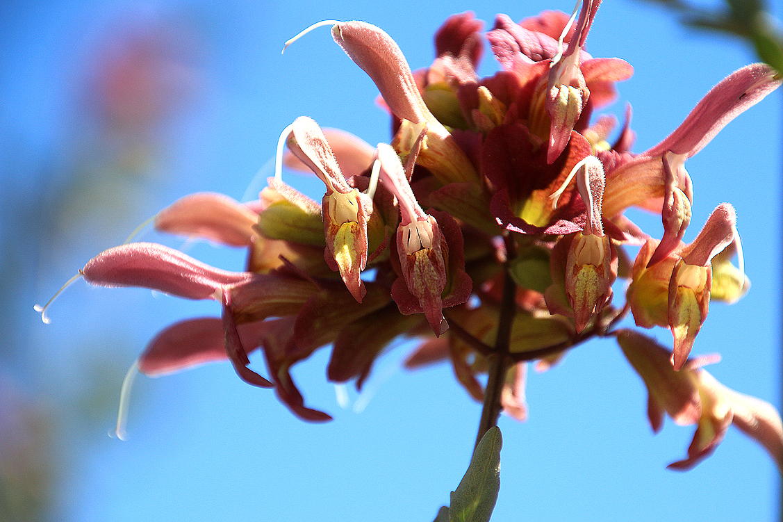 Stattdessen widme ich mich der nächsten, mir unbekannten Pflanze, die keine hundert Meter von unserer Veranda entfernt ihre üppig beblumten Zweige mannshoch gen Himmel reckt. Ihre Blütenfarbe changiert von Tönen zwischen schmutzigem Grüngelb über rostiges Orange und rötlichem Braun bis hin zu gedecktem Violett – und das an einer einzigen Pflanze! Seltam! Bei näherem Hinsehen allerdings stelle ich fest, dass die vermeintlichen Blüten gar keine sind. Es sind glockenförmige Gebilde, die weder Staubgefäße noch Stempel beherbergen und somit wohl eher Kelchblätter darstellen. Aber Kelchblätter welcher Blüte? Ich muss das wissen! Nach längerem Gewühle durch das umliegende Gebüsch werde ich endlich fündig: es ist eindeutig ein Lippenblütler, der von der Form her stark an Salbei erinnert, auch die Blätter riechen dementsprechend. Aber so hochwachsend und in DER Farbe??? Ich kenne Salbeigewächse mit weißen, gelben, rosa und bläulichen Blüten, nicht aber mit rostfarbenen! Hurtig befreie ich mich aus dem Gesträuch und eile mit einem Herbar-Muster zurück zum Bungalow. Lange muss ich nun suchen und blättern, doch schließlich ist auch dieses Rätsel gelöst. Es handelt sich hierbei um den sogenannten Goldsalbei (Salvia africana-lutea), der innerhalb der Salbeifamilie tatsächlich eine ungewöhnliche Stellung einnimmt – aufgrund seiner Größe, viel mehr aber noch wegen seiner ungewöhnlich gefärbten Blüten bzw. Pseudoblüten: beginnend im frühen Frühling, schiebt diese Pflanze über lange Monate hinweg immer wieder frische Blüten, die anfangs hellgelb sind, jedoch ziemlich schnell ihre Farbe verlieren und dabei einen Rostton annehmen, ohne total verwelkt auszusehen. Wenn die Blüte aber dann doch irgendwann abfällt, bleibt dieser sehr charakteristische Blütenkelch übrig, der sich farblich in einer großen Bandbreite bewegt, zudem noch wie eine Blüte aussieht – und mich so irritiert hatte. Doch jetzt hab ich ihn dingfest gemacht, diesen seltsamen Busch-Salbei!