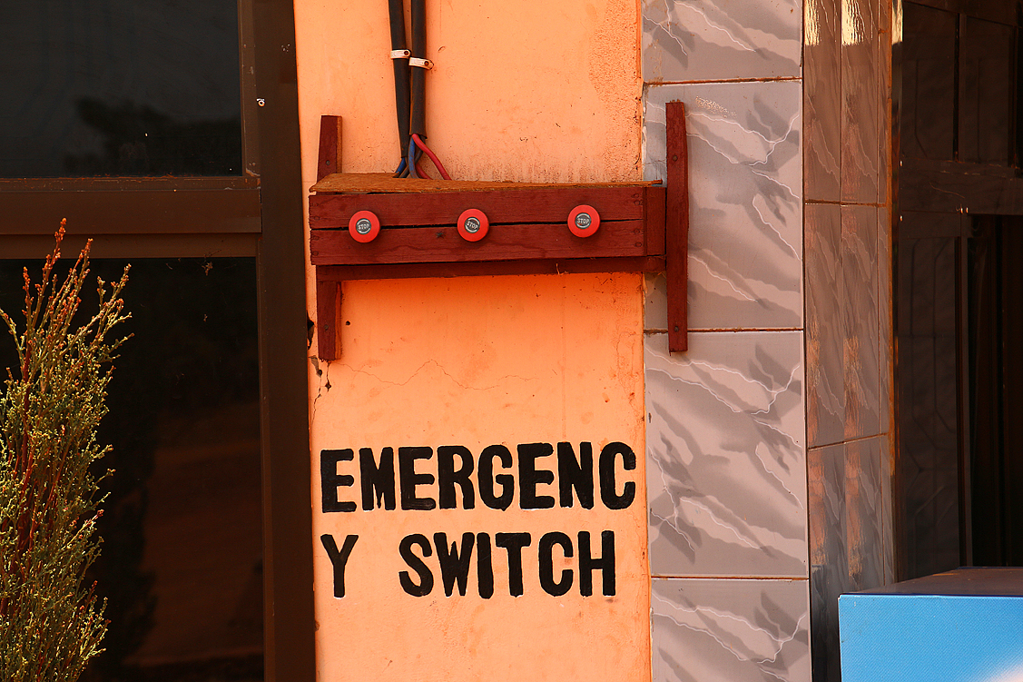 Auf der Außenseite eines kleinen Nebengebäudes, das die Elektrik der Gesamtanlage beherbergt, sind auf einer Holzleiste rote Notfallschalter angebracht, wie man sie bei uns beispielsweise von Drechselbänken oder älteren Druckmaschinen kennt. Darunter wurde fein säuberlich per Hand ein Schriftzug aufgepinselt: Emergency switch – Notfallschalter. Weil aber der Platz knapp war, steht da in der ersten Zeile nur „Emergenc“, in der zweiten hingegen „Y switch“. Das gesamte Konstrukt wäre bei uns in Deutschland undenkbar, der Schriftzug nicht regelkonform, doch es erfüllt seinen Zweck. Niemand muss vorher studiert haben, um es im Notfall bedienen zu können und das abgetrennte Y, das einsam und alleine in der zweiten Zeile steht, tut der simplen Verständlichkeit des Notfall-Boards auch keinen Abbruch.