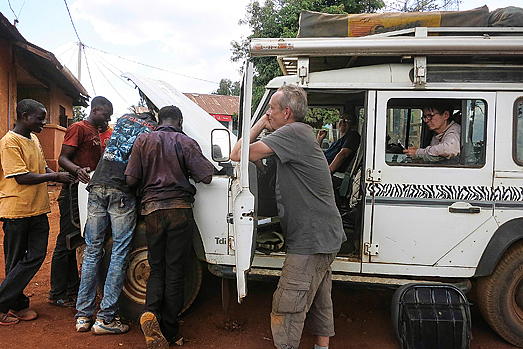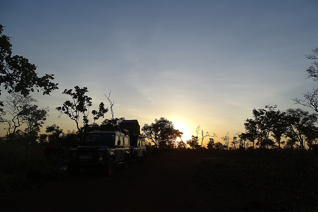 Gesagt, getan. Nach wenigen Kilometern erreichen wir tatsächlich eine Missionsstation, an der Jochen aber zielgerichtet vorbeifährt. Hallo? „Nö, die sieht so geschlossen aus!“ Spricht’s und fährt weiter. Auch das nächste Dorf lässt er links liegen und wir werden allmählich nervös und auch leicht ungehalten. Was soll denn das? „Das gefällt mir alles nicht!“ Dafür hält er kurz darauf in der Nähe eines freien, abgeernteten Feldes, auf dem noch einige Arbeiter zugange sind, und stapft zu Fuß über den Acker, direkt auf die Leute zu. Diese scheinen Jochens Aktion völlig falsch zu verstehen: sie schultern ihre Harken und strömen in Scharen auf den komischen Weißen zu, von dem sie sich offenbar eine Mitfahrgelegenheit erhoffen. Jochen stutzt kurz, winkt abwehrend und sieht dann zu, dass er Land gewinnt, bevor wir auch noch zwanzig mitfahrwillige Landarbeiter an der Backe haben. Mhm, würden wir nicht so dringend ein einigermaßen sicheres Nachtquartier benötigen, wäre diese Situation echt zum Schmunzeln… Doch nach Schmunzeln ist uns im Augenblick wirklich nicht zumute. „Ich habe mein Bestes gegeben. Doch wie ihr seht: hier ist nix zu machen. Also bleibt uns doch nur der Straßenrand, oder?!“ Nein, sicher nicht! „Beim nächsten Weg, der von der Straße weg in den Busch reinführt, biegen wir ab und sehen uns das mal an!“ Keine fünf Minuten später, die Dämmerung senkt sich bereits samten auf uns hernieder, zweigt erfreulicherweise wirklich eine vielversprechende Stichstraße nach rechts ab. Jochen schert willig ein und wir verständigen uns mit unseren Mitreisenden im zweiten Auto: ihr wartet hier, wir erkunden die Lage und rufen euch per Funk, wenn es gut aussieht. Erneut gesagt, getan. Jochen, Heinz und ich mäandern auf einem kurvenreichen Weglein hinein ins Gebüsch. Nach einem halben Kilometer entdecken wir eine kleine Hütte abseits der Fahrspur, aus deren Dach Rauch entweicht. Hah, da wohnt jemand, den fragen wir jetzt! „Barbara, mach du mal, du bist irgendwie besser mit sowas.“ Folgsam steige ich aus dem Auto und nähere mich vorsichtig rufend und grüßend der winzigen Rundhütte, doch niemand antwortet. In meiner Verzweiflung spähe ich schließlich, ohne eine Einladung zum Eintreten erhalten zu haben, in das Innere des Häuschens hinein. Keiner da. Unverrichteter Dinge kehre ich zu Jochen und Heinz zurück. „Ausgeflogen. Lasst uns den Weg aber noch ein Stück weiterfahren. Hier sind wir weit genug von der Hauptstraße entfernt und ich denke, das ist eine große Farm, auf der die Arbeit für heute beendet ist. Wenn wir noch jemandem begegnen, fragen wir, ansonsten bleiben wir einfach da und regeln alles andere morgen Früh.“ Hoffnungsfroh schrauben wir uns weiter in den Busch, bis wir schließlich einen geeigneten Standort unter mehreren großen Bäumen entdecken. Hier hätten alle Zelte Platz, es ist eben und niemand kann uns von der Hauptstraße aus entdecken. „Annette, bitte kommen! Wir haben was gefunden!“ Endlich!