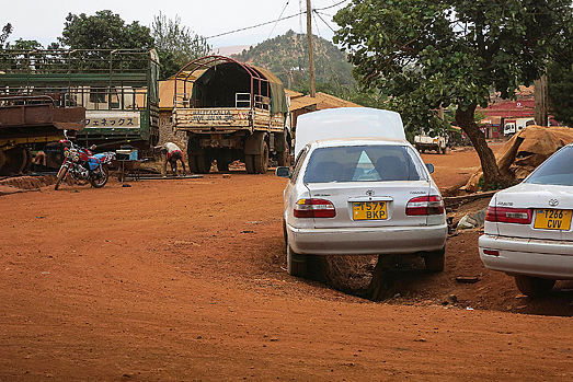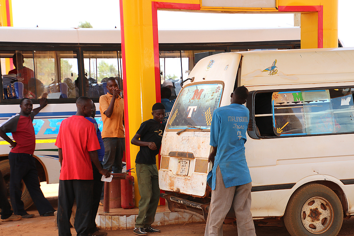 Traurig und ziemlich schockiert von dem eben Ges(ch)ehenen setzen wir unseren Weg fort und hoffen, dies möge kein böses Omen für den heutigen Tag sein. Doch ohne weitere Zwischenfälle erreichen wir Lusahunga, zockeln mit unter 50 Stundenkilometern durch das Örtchen, wehren winkend die Honig- und Nüsschenverkäufer ab, die sich uns schon wieder, ihre Waren laut anpreisend, aufdrängen, verlassen das Kaff und nehmen den nächsten Streckenabschnitt in Angriff, der uns nach Nyakanazi führt. Auch diese knapp 20 Kilometer sind noch geteert, der Belag jedoch ist, wie so oft Tansania, nicht sonderlich gut erhalten. So macht der Wechsel ausgefahrener Staubabschnitte und kümmerlichen Restteers, den man als solchen meist nicht mehr erkennen kann, das Fahren zu einer äußerst holperigen Angelegenheit, die starke Konzentration erfordert. Eine knappe dreiviertel Stunde kostet uns diese Strecke, dann empfängt uns Nyakanazi. Ein staubiges Nest, geschäftig, heruntergekommen und voller Müll. An den Straßenrändern stehen zahlreiche schmutzige Marabus, die ihr täglich Brot aus dem Weggeworfenen der Menschen picken, es gibt unzählige Kneipen und jeder dritte Shop beherbergt einen Alkoholladen. Kein Wunder, denn Nyakanazi ist ein Ort, an dem sich zwei Hauptrouten treffen, ein wahrer Verkehrsknotenpunkt in diesem entlegenen Teil Tansanias, auch wenn man das kaum glauben kann. Doch in Nyakanazi teilt sich die Straße: nach Osten zweigt die B3 ab; sie führt nach Dodoma, der offiziellen Hauptstadt Tansanias. In südlicher Richtung fährt man auf der B8 aus dem Ort heraus; sie zieht sich am Tanganjikasee entlang, immer mehr oder weniger weit von der Grenze zur DRK (Kongo) entfernt, biegt schließlich in einem sanften Bogen nach Osten und bringt einen direkt nach Tunduma, den Grenzübergang nach Sambia – die Route, die auch wir einschlagen werden. Nun ist dieser westliche Teil Tansanias nicht gerade der strukturstärkste, doch natürlich gibt es auch hier Menschen und Geschäfte, die mit Waren versorgt werden wollen, Lkw-Fahrer, die diese Strecke befahren müssen und so etwas wie einen öffentlichen Nahverkehr, der die hier ansässigen Leute von A nach B transportiert. Und all diese Personen treffen in Nyakanazi aufeinander, froh um eine Pause, froh, ihre verstaubten Kehlen benetzen, den Müll einer langen Fahrt entsorgen zu können. Und dementsprechend sieht es hier aus.