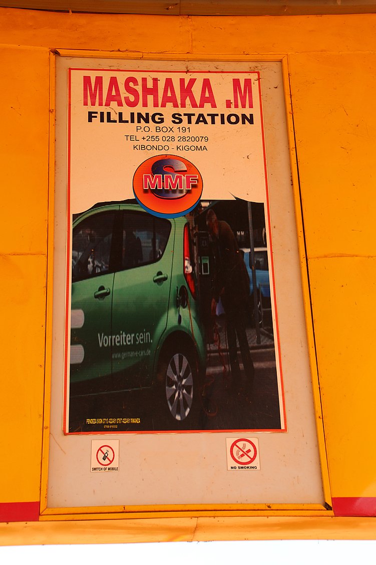Schaukelnd und ächzend kurven wir auf den Hof der Treibstoffstation, rangieren uns in genehmer Entfernung der Zapfsäulen ein und freuen uns, dass die Sonne so günstig steht, dass die Zapfsäulenüberdachung ihren Schatten drei Meter neben die Zapfgasse und somit auf uns wirft. Sofort eilen einige Einheimische herbei, die sehen wollen, warum wir Touris uns gegenseitig abschleppen. Helfen jedoch können sie uns nicht, denn es gibt, entgegen unserer Hoffnung, doch keine Werkstatt. Immerhin aber dürfen wir hier stehenbleiben und uns selbst um unser Dilemma kümmern. Jochen und Heinz, die ja, wenn man das so nennen darf, schon eine gewisse Routine in Sachen Lichtmaschine haben, gehen das Problem wie gehabt an: Motorhaube auf, bis zu den Ellbogen in den Eingeweiden des Autos versinken, Heinz reicht Jochen das erforderliche Werkzeug – wie eine Krankenschwester dem Chefchirurgen – stöhnen, keuchen, fluchen. Teil um Teil wird die Lichtmaschine auseinandergenommen, Teil um Teil landet auf einem auf dem Boden ausgebreiteten Geschirrtuch, Teil um Teil wird Jochens Gesicht sorgenvoller, bis er schließlich wieder zum bewährten Knetstahl greift und ihn beherzt in den ausgeleierten Anker der Lichtmaschine drückt. Na ja, warum sollte das nicht wieder funktionieren, schließlich hat die erste Reparatur auch über zwei Wochen gehalten! Jochen allerdings reagiert schon wieder unwirsch, wenn ihm einer der zahlreichen Tankstellenbesucher neugierig oder, noch schlimmer, pseudo-fachmännisch über die Schulter schaut und schlaue Kommentare von sich gibt. Kein gutes Zeichen! In solchen Situationen, wenn ich schon nicht helfen darf, verkrümle ich mich gerne und gehe der schlechten Stimmung aus dem Weg – der Jochens und meiner eigenen… Wir sind dem Katavi so nahe und ich könnte es echt nur schwer verkraften, da nun doch nicht mehr hinzukommen, weil das doofe Auto zickt. Also verziehe ich mich, soweit es die Örtlichkeit eben zulässt. In diesem Falle beschränkt sich mein Radius auf den nahen Umkreis der Zapfsäulen, das Gelände der Tankstelle. Doch es gibt genug zu entdecken, was meine Laune sofort wieder hebt: über den Zapfsäulen hängen Werbeplakate, die die Modernität der Tankstelle visuell unterstreichen sollen. Auf einem der Plakate sieht man ein Elektro-Auto der absolut ersten Generation, in frechem Bio-Grün und mit deutscher Aufschrift, auf dem zweiten ein Mercedes, Typ Rohöl-Schaukel aus dem vorvorletzten Jahrzehnt des vergangenen Jahrtausends, die zudem noch ein Münchner Kennzeichen zur Schau stellt! Wo der Tankstellenbetreiber diese Bilder wohl her hat?