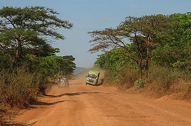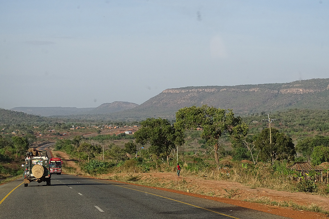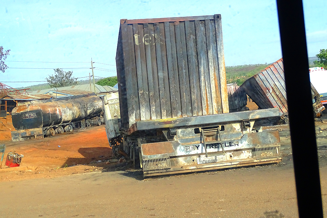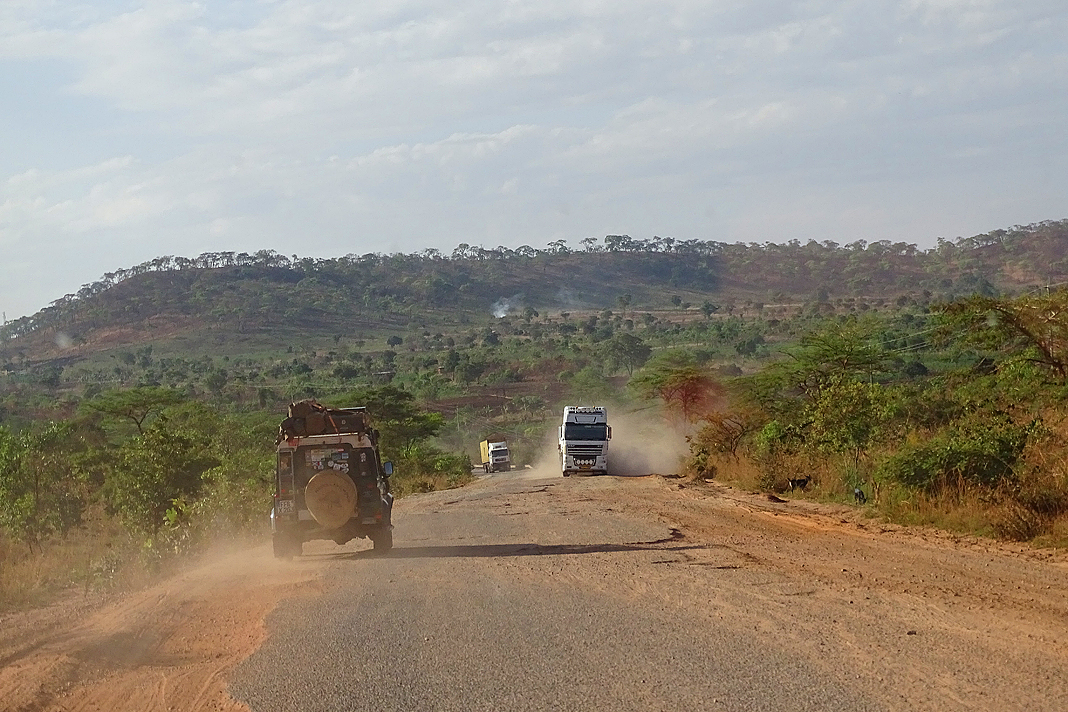 Auch wir sind froh – froh, diesen ungemütlichen Ort verlassen zu können und auf unserem Weg zum Katavi ein gutes Stück weiterzukommen. Am Ortsausgang verabschiedet uns allerdings noch das Bild eines vergangenen Desasters. Drei Lkws, darunter auch ein Tanklaster, liegen ausgebrannt in einer kleinen Senke vor ein paar Wohn- und Ladengebäuden. Im Umkreis von vielen Metern ist alles verbrannt, verrußt, geschwärzt, der einzige Baum in der näheren Umgebung bietet ein trauriges Bild – und die Menschen und Marabus staksen über den verkohlten Boden, als wäre nichts gewesen. Ich mag mir gar nicht ausmalen, wie viele Leute bei diesem schrecklichen Unfall zu Schaden gekommen sind. Auf der weiteren Strecke jedoch, Teerbelag hat diese Straße noch nie gesehen, relativiert sich meine Schreckensvorstellung – ich bin beinahe erleichtert, dass dieses Unfallzeugnis das einzig sichtbare bleibt. Denn angesichts dessen, was sich auf dieser rumpeligen, staubigen, schmalen, schlaglochdurchsetzten B8 tut, grenzt das an ein echtes Wunder! Die Piste windet sich durch mehr oder weniger dichtes Buschland, man sieht nicht, was einem hinter der nächsten Kurve entgegenkommt: Fußgänger, Radfahrer, ein Kleinkraftrad, ein großer Bus, ein Lkw, ein kleiner Personentransporter? Nur einer Sache kann man sich sicher sein – der Gegenverkehr fährt, aufgrund des grottenschlechten Zustands der Piste, meist auf der falschen Seite, und, trotz des schlechten Zustands der Piste, fast immer viel zu schnell. Da rasen uns völlig überladene Laster auf unserer Seite entgegen und scheren erst im letzten Moment schlingernd nach rechts aus, Minitaxis, auch Dala-dala genannt, zugelassen für maximal sechzehn Personen, schlingern mit siebzig Sachen und sechsundzwanzig Passagieren nebst deren üppigem Gepäck an Bord in maximaler Schräglage um ausgefahrene Kurven, wehrlose Fußgänger materialisieren sich von einem Moment auf den anderen aus einer Staubwolke heraus, hin und wieder taucht plötzlich die Schnauze eines Reisebusses auf und droht uns, aufgrund seiner schieren Breite, von der Straße zu drängen. Es ist ein sehr spezielles Erlebnis. Oder sollte ich das Kind beim Namen nennen und sagen: es ist der Horror?!