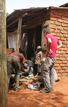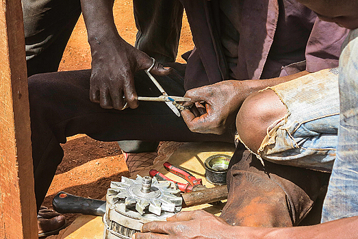 Und wir haben Glück: bereits nach kurzer Zeit weist uns ein freundlicher Herr den Weg; eine steile Gasse nach oben, dann rechts, kurz danach wieder links und dann Gari Fundi, Gari Fundi nzuri! Heissa! Ein Auto-Mann, und ein guter noch dazu! Enthusiastisch folgen wir der Wegbeschreibung und landen wenig später tatsächlich, am obersten Ende einer steil abfallenden Straße, bei einem Grundstück, auf dem verdächtig viele Schrottfahrzeuge und auseinandergenommene Karossen herumstehen. Wir steigen aus. Sofort eilen ein paar junge Männer herbei und erkundigen sich, was unser Begehr sei. Gari Fundi? Gari Fundi! Radebrechend, mit Worten, mit Händen und Füßen versuchen wir unser Problem zu schildern. Der Fundi winkt nur ab und bedeutet uns, einfach vorbeizukommen. Dankend verabschieden wir uns, düsen zu Annette, hängen ihr Auto ans Abschleppseil und eine halbe Stunde später schlagen wir alle erneut bei unserem Fundi auf. Der ist sofort zur Stelle, weist uns einen Standplatz zu, krempelt die Ärmel hoch und setzt Prioritäten. Frauen? Die kann er jetzt nicht brauchen. Bei einer benachbarten Bar (ein kleiner Holzverschlag in Flugzeugtoiletten-Größe, ohne Kühlschrank), organisiert er vier Plastik-Stühle, platziert diese im Schatten eines ausladenden Baumes, bittet uns, Platz zu nehmen und wendet sich dann an unsere Männer. Problem? Jochen öffnet die Motorhaube des weißen Landys, deutet auf die Lichtmaschine, gibt das Schadensbild nachahmende Geräusche von sich, der Fundi nickt verständig und macht sich ans Werk. Mithilfe seines eigenen Werkzeugs, das er wohl selbst aus alten Schrottteilen zusammengeschweißt hat, und dem Inhalt unserer Werkzeugkiste schält er sachverständig den Freilauf aus der Lichtmaschine, begutachtet ihn, ruft ein paar Helfer herbei, schildert diesen das Problem, einer spurtet los und kehrt Minuten später mit einer kleinen, dünnen Blechplatte wieder. Mit einer arg mitgenommenen Blechschere wird nun ein Stückchen aus der Platte geschnibbelt, rundgebogen, probehalber eingepasst, begradigt, am Rand vielfach eingeschnitten und schließlich umgebördelt. Ich bin fasziniert: das alles geht per Augenmaß, aber es passt, nach ein paar minimalen Korrekturen, wie maßgeschneidert. Und der Fundi weiß zudem genau, was er da tut. Es wird nicht rumgetan, nicht lange hin- und her überlegt, die Lösung des Problems wird einfach zielstrebig angegangen und mit einfachsten Mitteln bewerkstelligt. Ich ziehe meinen Hut vor diesem Mann und gebe dem auch verbal Ausdruck. Der Fundi nimmt’s zur Kenntnis, lächelt mich milde an – und ich sehe, was er denkt: Frau. Was versteht die schon davon…? Egal! Ich bleibe dabei – das ist genial.