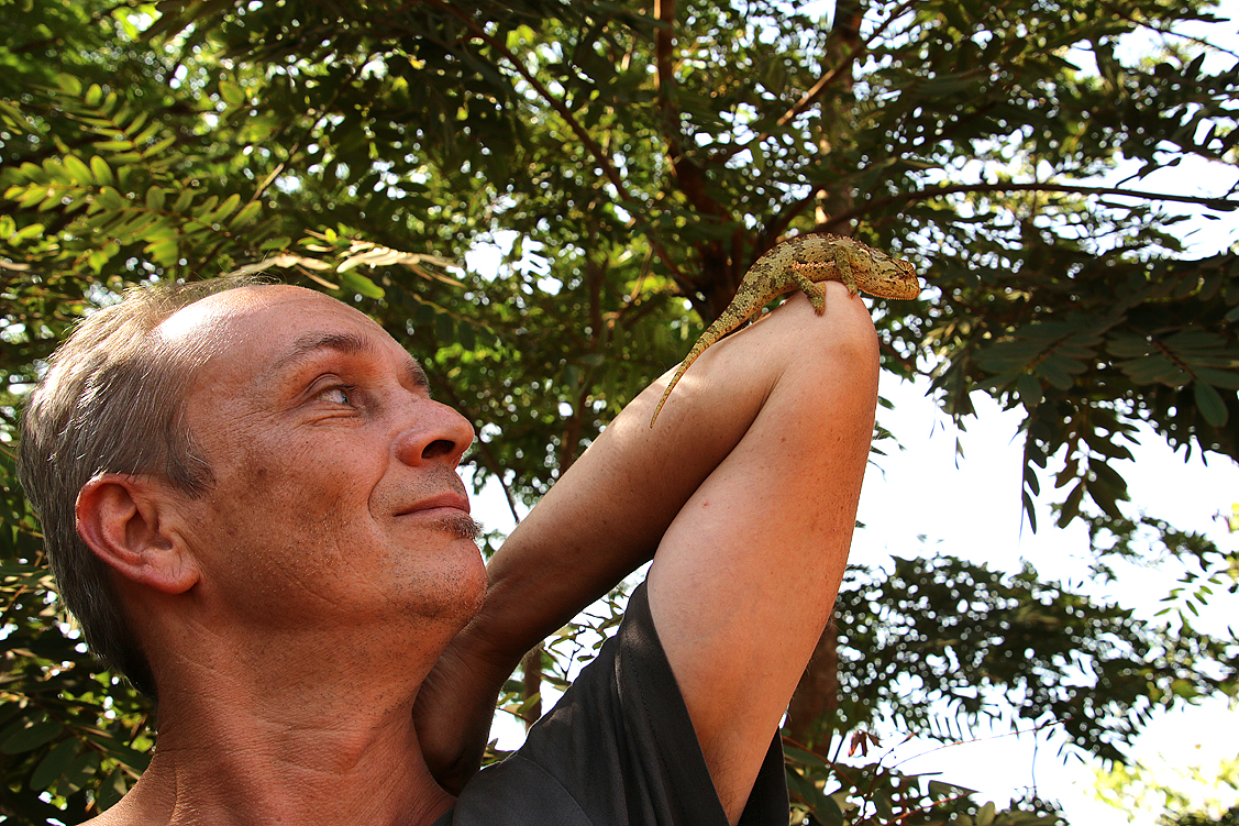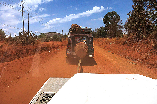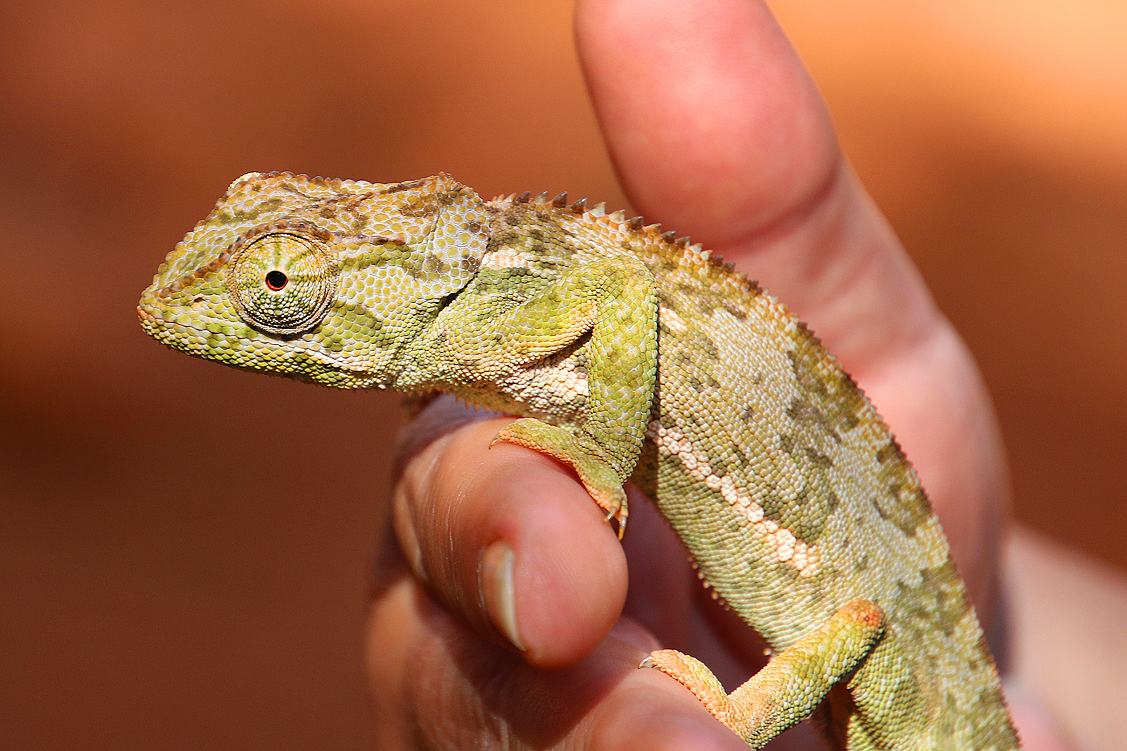 Unendlich lange juckeln wir auf dieser Schreckenspiste dahin, versuchen, uns gegenseitig in den allgegenwärtigen Staubwolken nicht aus den Augen zu verlieren, passieren ein paar Dörfer, die uns zumindest einen Ansatz von Ahnung verleihen, wo genau wir überhaupt sind, als Jochen eine Vollbremsung hinlegt. Jochen? „Da war ein Chamäleon!“ Uih, ein Chamäleon! Hurtig springen wir aus dem Auto und pflücken das grüne Tierchen aus dem Straßenstaub. Ein Wunder, dass es noch am Leben ist – sich auf dieser Straße zu bewegen, erst recht mit vier kurzen Beinchen, kann echt böse ausgehen. Und kein Bus-, Lkw- oder Dala-dala-Fahrer wird wegen so einer winzigen Echse bremsen. Während das Chamäleon nun von Hand zu Hand wandert und wir es gebührlich bestaunen, reden wir auf das Reptil ein und erzählen ihm, in welcher Gefahr es gerade geschwebt hat. Das Tier jedoch hat mehr Angst vor uns, als vor der Horrorpiste, und als es sich schwarz zu färben beginnt, setzen wir es behutsam in einen Baum etwas abseits der Fahrspur; natürlich nicht ohne es abermals zu ermahnen. Augenrollend verschwindet das Echslein im Laub, wir verstauen uns erneut in unseren fahrbaren Untersätzen und nehmen wieder Fahrt auf. Mhm, Chamäleons werden doch in vielen Gegenden Afrikas für Unglücksbringer gehalten. Sollten also auch wir ein schlechtes Omen darin sehen? Dieser Gedanke schießt mir unwillkürlich durch den Kopf, als sich Annette wenige Kilometer später über Funk meldet und wir, zwischen all dem Rauschen und Knacksen nur die Worte „Auto“ und „Problem“ verstehen.