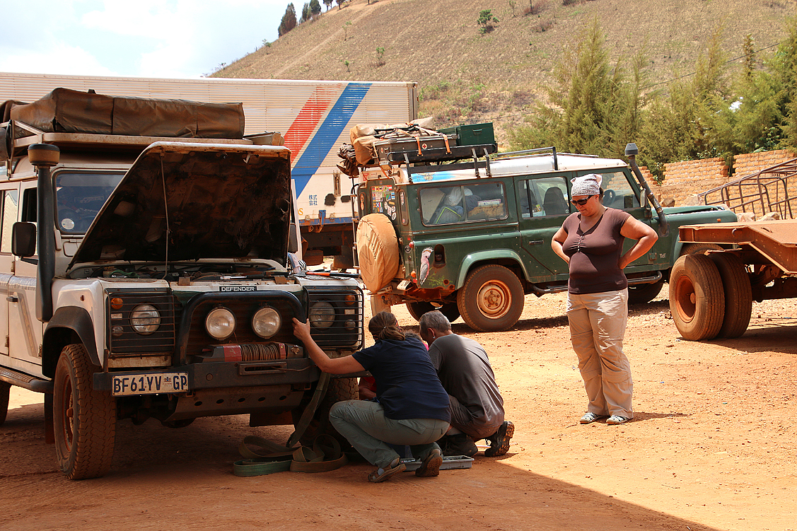 Ne, bitte nicht schon wieder! Langsam rollen wir am Straßenrand aus und warten auf unser Sorgenkind. „Kommen..“, „nicht…“, „Kaputt…“ krächzt es aus dem Walkie-Talkie. Seufzend wenden wir unseren Wagen, ein nicht ganz ungefährliches Unterfangen, fahren zurück und treffen wenig später auf den weißen Land Rover, der, samt seiner gestikulierenden Insassen, am Rande der Piste steht. „Jochen, ich glaub, es ist wieder die Lichtmaschine! Es schlägt und kracht so komisch und ich trau mich keinen Meter mehr weiterzufahren!“. „Ach, was! Das haben wir gleich…“, meint Jochen cool, schiebt seine lamentierende Gattin beiseite, steigt ins Auto und startet es. Es schlägt und kracht vernehmlich. Jochen würgt sofort den Motor ab. „Tja, wir müssen schleppen. Barbara, wann kommt das nächste Kaff?“ Oh, Scheiße! „In ein paar Kilometern. Ist ein größerer Ort und hat laut Karte sogar ’ne Tankstelle.“ „Das ist gut!“ Jochen schaltet nun auf emotionalen Durchzug, kramt das Abschleppseil aus dem grünen Landy, parkt sich in Position, hängt den weißen an und schon kann’s weitergehen, im Abschlepptempo… Unendlich langsam und schwer manövrierbar kriechen wir über die Staubstraße, immer den taumelnden Gegenverkehr im Auge, und schlagen uns so tatsächlich unbeschadet zum nächsten Ort durch, der ungefähr 10 Kilometer entfernt ist. Am Ortseingang, man kann weit und breit noch nichts von einem Dorf erkennen, empfängt uns eine recht spaziöse Tankstelle, deren Ausmaße uns zunächst Hoffnung auf eine angegliederte Werkstatt machen.