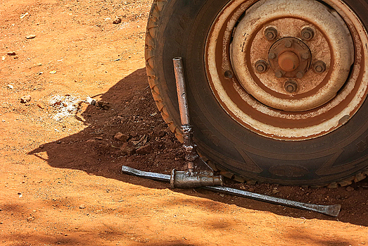 Natürlich ist das alles keine Sache von einer halben Stunde, sondern dauert schon seine Zeit. Zeit, die wir unbeteiligten Frauen nutzen, das Ambiente in uns aufzusaugen und uns an diversen Kleinigkeiten zu erfreuen. Da sind zum Beipiel der Fundi und seine Helfer, die sich teilweise zu fünft über die Motorhaube und das zu reparierende Werkstück beugen – und es ist sehr interessant, sie dabei zu beobachten, denn sie alle legen ein sehr unterschiedliches Arbeitsverhalten an den Tag. Einer hält sich gerne im Hintergrund, scheint keinen Schimmer zu haben, was da vor sich geht, will sich aber nicht die Blöße geben, nachzufragen. Ein Zweiter versucht sich zu drücken, indem er Werkzeug herbeischafft, das keiner braucht. Als ihn der Fundi schließlich nach einer Feile schickt, eilt er von dannen und ward nicht mehr gesehen. Ein Dritter assistiert dem Chef mit der Präzision einer OP-Schwester und scheint immer genau zu wissen, was dieser als nächstes vorhat, wohingegen der Vierte versucht, einen chefmäßigen, wissenden Anschein zu erwecken, indem er wichtig herumzappelt, stets Sekunden nach dem Dritten nach dem benötigten Werkzeug greift und dann so tut, als hätte er den Kollegen nur anleiten wollen. Damit niemand merkt, dass er keine Ahnung und zudem auch keine Lust zu arbeiten hat, versucht er, das Ganze mit aufgeblasenen Kommentaren zu vertuschen. Ich amüsiere mich königlich: ich sitze hier am Arsch der Welt, in einer Autowerkstatt, die mit einer in unseren Breiten nicht ansatzweise zu vergleichen ist, die Personalstruktur aber scheint in jeder Firma auf dem ganzen Erdball ähnlich zu sein. Es gibt immer mindestens einen Doofen oder Schlamper, einen Drückeberger, einen G’schaftler oder Möchtegern-Chef und einen Engagierten, der die Unfähigkeit der anderen mit seinem Wissen und seinem Fleiß kompensiert. Und überall auf der Welt gibt es geborene Charmeure, die wissen, was sich gehört – seien sie auch noch so jung oder schüchtern: ein kleiner Junge, 10 oder 12 Jahre alt, bekleidet mit einem T-Shirt und einer Hose, war bereits bei unserer Ankunft neugierig herbeigeeilt, beobachtete die Situation eine Weile, verschwand dann wieder und kehrte fünf Minuten später zurück: angetan mit einem viel zu großen Sakko und sonnengelben Crocs, die er extra über seine staubigen Füße gestülpt hat. Seitdem wohnt er, angelehnt an eine Holzsäule der benachbarten Bar, dem Geschehen bei, verschwindet verschämt-schüchtern hinter dem Balken, sobald seine und unsere Blicke sich treffen, taucht aber sofort danach wieder auf, spielt mit seiner Schüchternheit und uns, zwinkert uns sogar hin und wieder verwegen zu – und, ich könnte fast wetten, errötet dabei zart unter seiner dunklen Haut.
