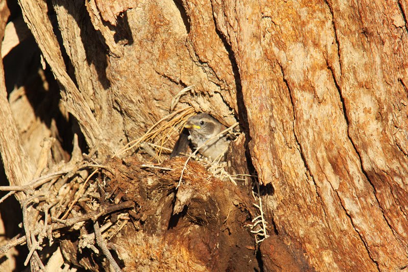 Aus einer kleinen Bruthöhle starren mich erschrocken vier schwarze Knopfaugen an, die gerade noch weit aufgesperrten Schnäbel zweier Kap-Sperlings-Nestlinge klappen zu und, schwupp, weg sind sie. Ich bleibe stehen, bewege mich für Minuten keinen Millimeter mehr und werde bald belohnt: Papa kehrt mit fetter Beute wieder, setzt sich auf einen Ast in der Nähe der Kinderstube, prüft die Sicherheitslage, stuft mich offenbar als harmlos ein und reicht seinen flauschigen Sprößlingen die mitgebrachte Mahlzeit dar. Aufgeregt strecken die Kleinen ihre Köpfe diesem Segen entgegen, sperren ihre kurzen, von leuchtend gelben Wülsten gesäumten Schnäbel weit auf und tun laut fiepsend ihren nahezu unstillbaren Hunger kund. Ein Küken wird gefüttert, das andere geht einstweilen leer aus, Papa verschwindet, Mama kommt und stopft den zweiten gierigen Rachen. Lange beobachte ich dieses Schauspiel, werde von den Vögeln in der Zwischenzeit überhaupt nicht mehr beachtet, bin irgendwie Teil ihrer Umgebung geworden und wage es deshalb, mich leise näher zu schleichen. Einen knappen Meter vor dem Höhleneingang nehme ich auf einem dicken, s-förmig geschwungenen Ast Platz und richte mich dort bequem ein – Aug in Aug mit den Sperlingskindern, die rasch ihre Köpfe einziehen – und versuche mein Glück, hautnah dabei zu sein. Papa lässt nicht lange auf sich warten. Er fliegt herbei, hält inne, beäugt mich kurz, rauscht dann aber unbekümmert an meinem Kopf vorbei, so nahe, dass ich den kühlen Windhauch seines Flügelschlags an der Wange spüre und kredenzt seinem Nachwuchs den nächsten Leckerbissen. Fast habe ich den Eindruck, er würde auch mich ohne Zögern füttern, risse ich meinen Mund nur weit genug auf, doch ich verzichte auf einen Versuch und „begnüge“ mich stattdessen mit dem einmaligen Erlebnis, vertrauensvoll geduldeter Gast dieses Familienidylls sein zu dürfen.
