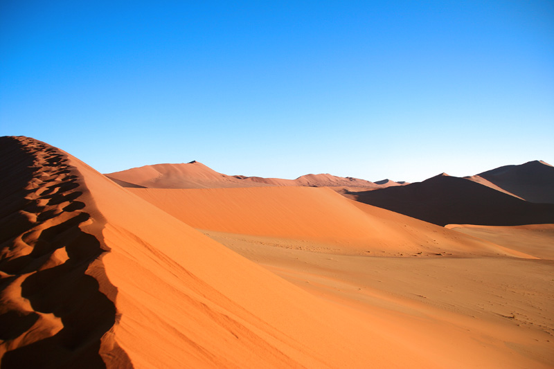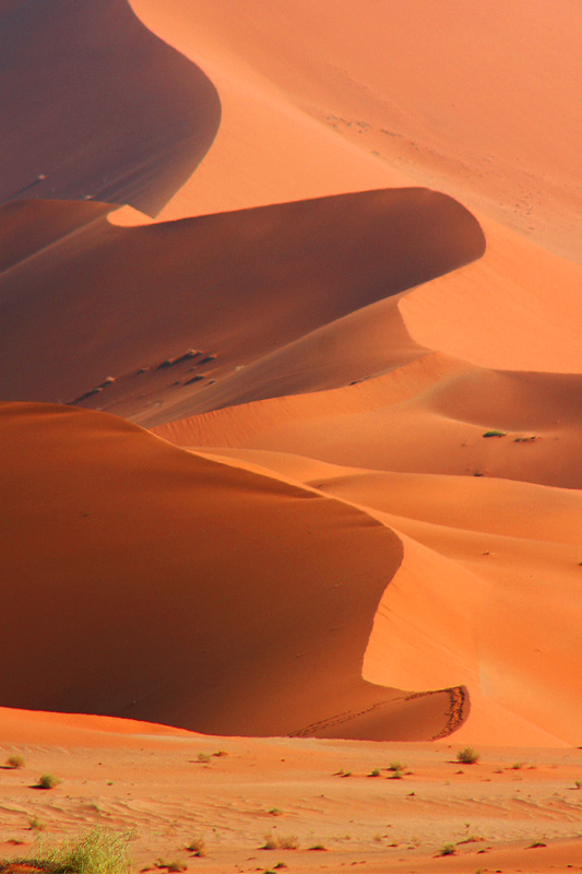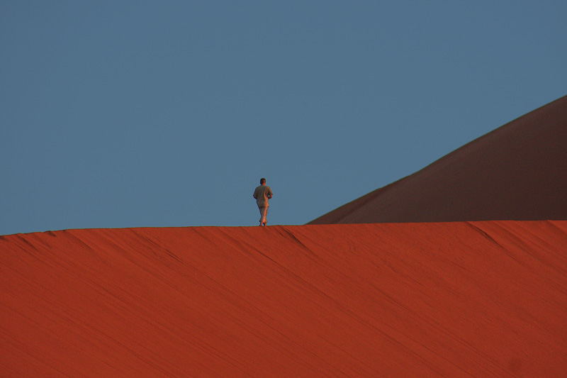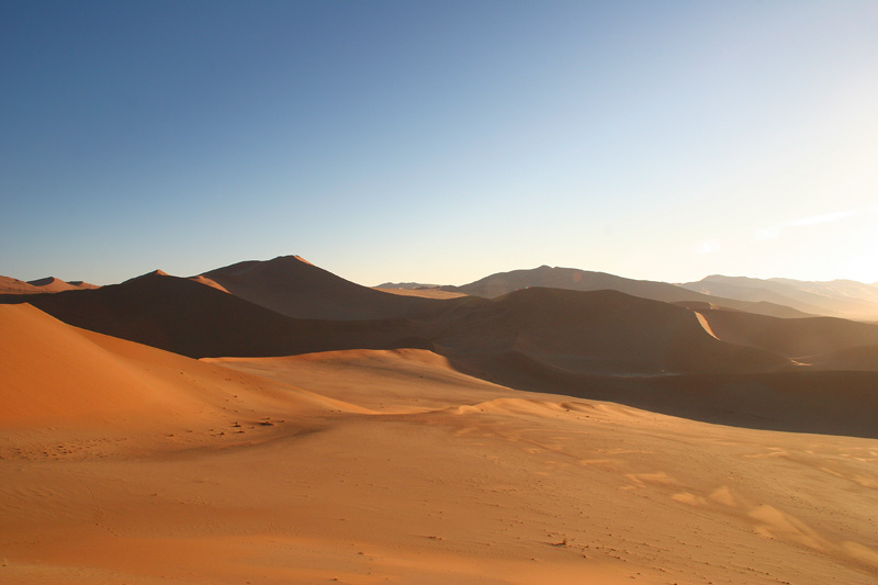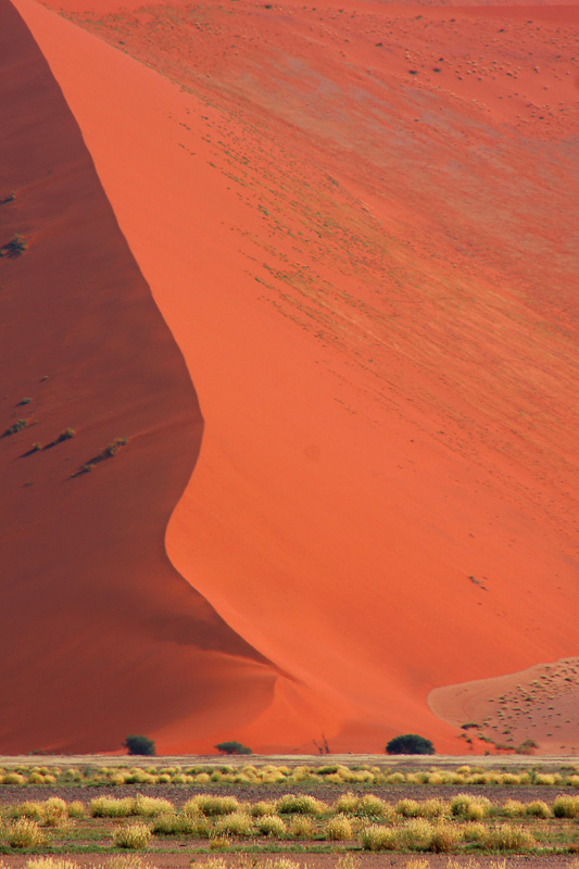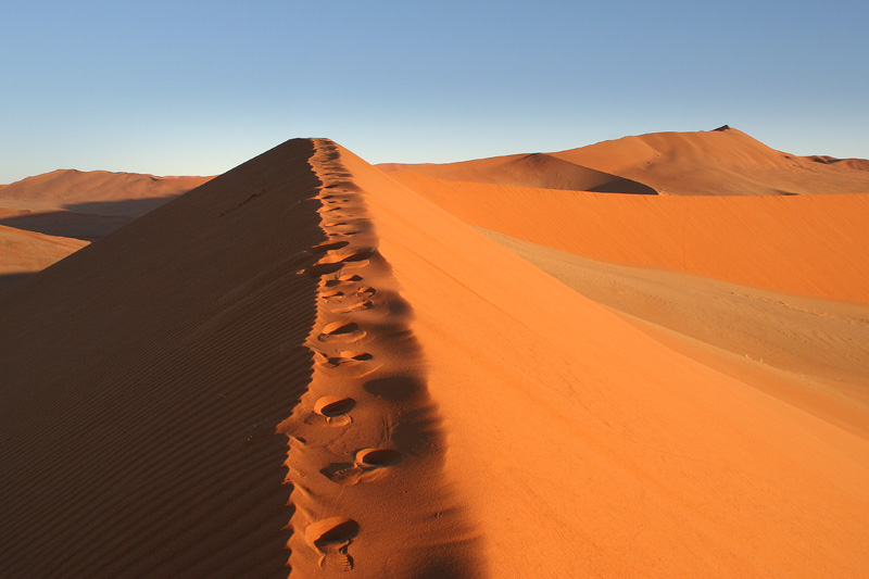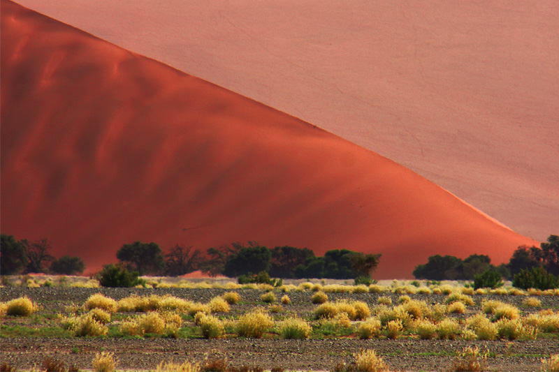 Gut 200 Meter hoch sind die höchsten Dünen rund um Sossusvlei, sie wandern nicht, verändern aber fortwährend ihre Form und Farbe. Winde, die aus ständig wechselnden Richtungen kommen, haben diesen riesigen Sandhaufen Konturen verliehen, messerscharfe Grate aufgeweht – sie sehen aus wie schlangenförmige Bügelfalten in der von einer allzu beschwingten Haushälterin geplätteten Anzughose. Die flachstehende Morgensonne arbeitet nicht nur diese Bügelkanten äußerst plastisch heraus – die Lichtseite des Grates leuchtet rot, die Schattenseite ist tiefschwarz – sondern offenbart weitere Taten der eifrigen Haushälterin: rechts und links der Kämme hat sich der Sand zu welligen Rippen im Zebrastreifenmuster gekräuselt, was den Flanken etwas sehr Lebendiges verleiht. Dabei liegt dem hübschen Wellenmuster ein recht einfaches physikalisches Prinzip zugrunde: eine richtungsdominierte Krafteinwirkung namens Wind, die kleine, temporäre Siege über die Gravitation erringt und mit ihrem Druck einen Gegensog erzeugt, erschafft die fast grafisch wirkenden Rippelmarken. Von der Gesetzmäßigkeit her wirken hier übrigens (mehr oder weniger) die selben Kräfte, die auch die Sterndünen von Sossusvlei zusammengeweht haben, die, aus der Luft betrachtet, ebenfalls ein Rippelmuster in groß ergeben. Und dann haben wir da noch die Morgensonne, deren Strahlen in einem so flachen Winkel durch die Erdatmosphäre dringen, dass ein Phänomen namens Rayleigh-Streuung besonders augenfällig in Erscheinung tritt: Licht besteht aus elektromagnetischen Wellen, die vom menschlichen Augen als Farben wahrgenommen werden und jede dieser Farben hat ihre charakteristische Wellenlänge: Rot die längste, Blau die zweitkürzeste. Und die Länge der Frequenzen hat Konsequenzen; kurzwellige Farbanteile des Lichts werden durch die in der Atmosphäre schwebenden Partikel viel stärker gestreut (also geschluckt) als langwellige. Somit ist das langwellige Rot in der Lage, den Staubmantel der Erde auf langer, flachwinkeliger Strecke fast ungestreut zu durchdringen, während sich der blaue Anteil in den Partikelwolken verliert. Trifft dieses derart gefilterte Licht nun auf die eisenoxidhaltigen Sandkörner, die ja selbst schon rostrot sind, erglühen diese in absolut unglaublichen Farbtönen: von orangebraun über zinnoberrot bis hin zu rostorange, lachsrot, beigerot und safranfarben. Alles in allem ein gigantisches Fest für die Augen, ein Zusammenwirken von Faktoren, an dessen Ergebnis man sich nicht sattsehen kann: einerseits, weil es so unfassbar schön ist, andererseits, weil dieses Licht nicht lange vorhält.