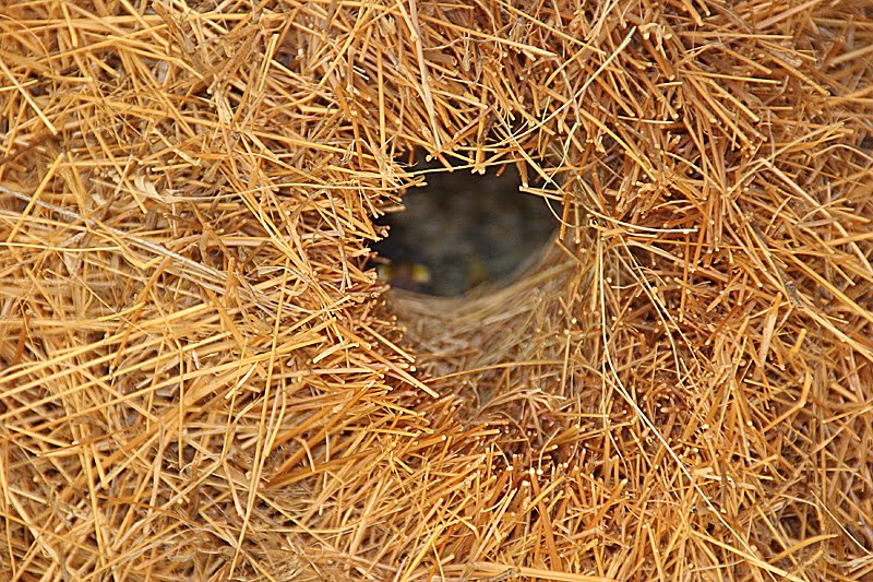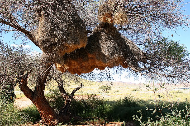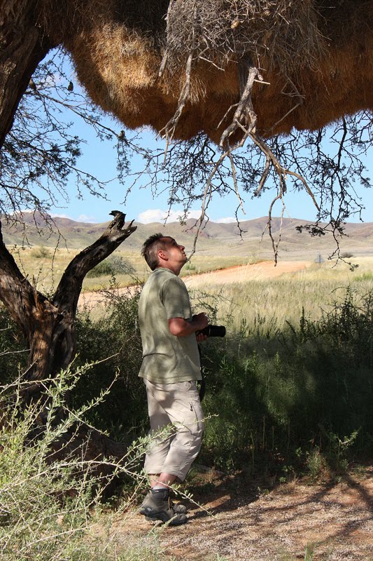 23 Kilometer später erreichen wir dann die Abzweigung auf die D707, der wir folgen, denn sie führt Richtung Koiimasis. Weit jedoch kommen wir nicht, denn bereits nach ein paar hundert Metern erspäht Heinz ein riesiges Siedelweber-Nest in einem niedrigen Baum direkt neben der Straße. Und natürlich wollen wir uns die Gelegenheit, solch ein phantastisches Bauwerk nebst seiner tschilpenden Bewohner aus allernächster Nähe betrachten zu können, nicht entgehen lassen. Staunend stehen wir unter der imposanten Graskonstruktion mit ihren unzähligen Eingängen und lugen neugierig in die Nistlöcher. Heinz entdeckt eines, in dem tatsächlich zwei noch ganz kleine Nestlinge zu sehen sind und versucht, dieses Bild mit der Kamera einzufangen. Ich ergötze mich währenddessen an seiner sichtlichen Begeisterung und an den erwachsenen Vögeln, die rund um uns auf den Ästen sitzen, aber verständlicherweise weniger Begeisterung über unsere Anwesenheit zeigen. Plötzlich jedoch erregt eine Bewegung auf dem sandigen Boden unter dem Nest mein Interesse. Das sind aber seltsame Käfer, denke ich mir gerade noch, als ich in die Hocke gehe, dann allerdings erkenne ich, was da wirklich zu meinen Füßen so emsig herum krabbelt. Wah, es sind Zecken, riesige, blutsaugende Spinnentiere mit Körpern von der Größe eines Fingernagels! Mich gruselt, gleichzeitig bin ich aber fasziniert von dem Gedanken, was wohl passiert, wenn solch ein Monster an ein winziges, wehrloses Webervogel-Küken andockt und zu saugen beginnt: zubeißen, Gerinnungshemmer injizieren, gulp, gulp und leer ist der Vogel?! Ich erschauere, vergesse in meiner gleichzeitigen Faszination jedoch leider völlig, sowohl mich aus der zeckenverseuchten Zone zu schaffen, als auch meine Freunde zu warnen.