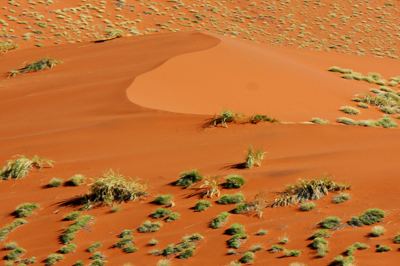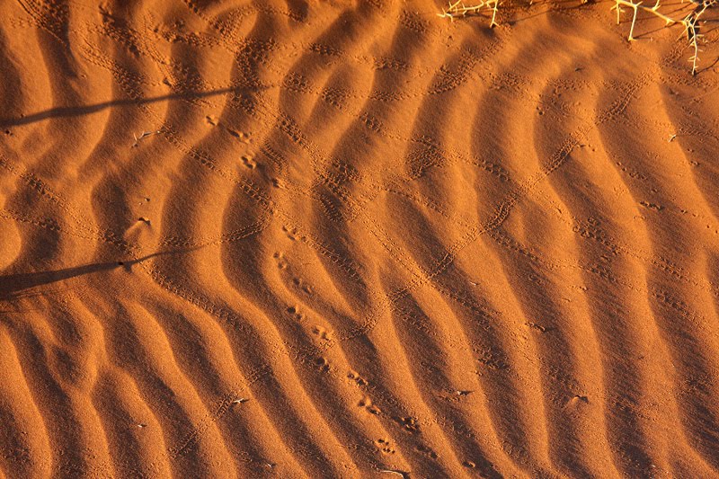 Die vier Vögelchen und ihr Tun fesseln mich ungemein, trotzdem aber lasse ich auch die mich umgebenden Dünen nicht aus den Augen, denn sie ziehen mich mindestens ebenso in ihren Bann wie die Kap-Sperlinge. Rein sachlich gesehen sind diese Tonnen und Abertonnen roten Sandes ja nichts weiter als zu Hügeln zusammengewehte Erosionsprodukte, die sich auf dem Fundament einer uralten Wüste gesammelt haben, ihre Vorgängerin nun gänzlich bedecken und dabei zudem noch vor sich hin rosten. Diese Szenerie nur sachlich zu betrachten ist jedoch ein ziemliches Ding der Unmöglichkeit, denn Wind, Sonne und Eisenoxid haben hier eine Kulisse geschaffen, wie sie meisterhafter, faszinierender nicht sein könnte. Trotzdem lohnt sich ein kleiner, nüchterner Blick auf die physikalischen Phänomene, die diesen Sandbergen zu solcher Schönheit verhelfen.