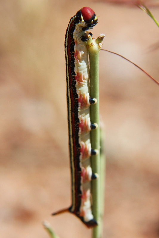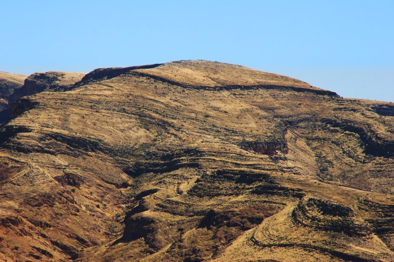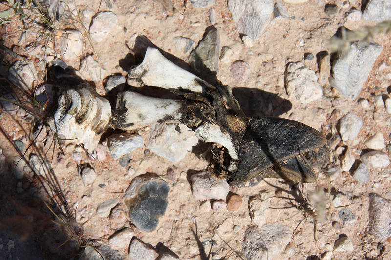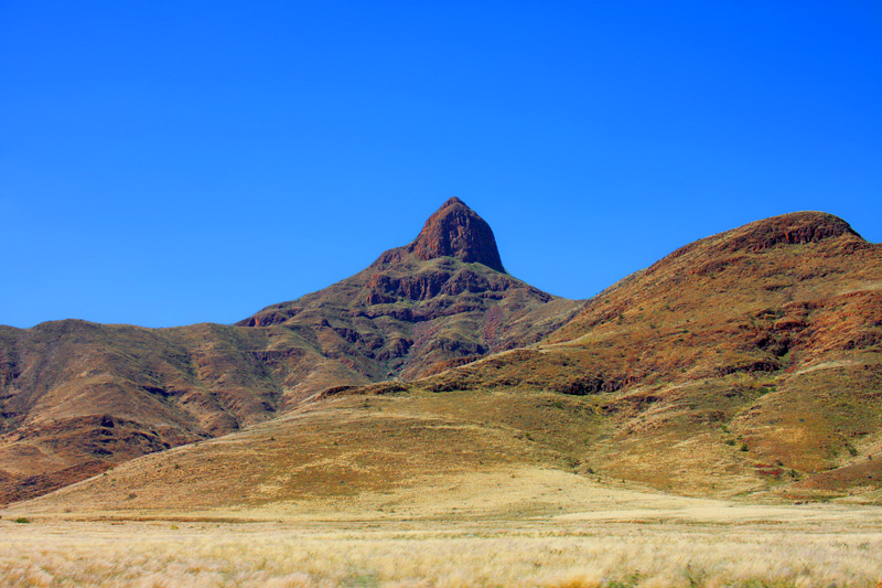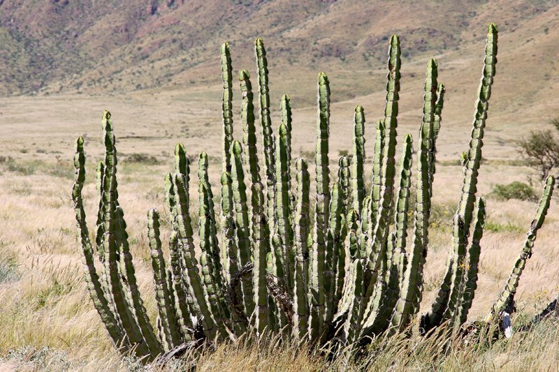 Froh, dass das Ganze anscheinend glimpflich abgelaufen ist, verliert sich meine Zerknirschung auf den nächsten Kilometern allmählich und ich kann die abwechslungsreiche Landschaft wieder voll und ganz genießen. Karstige Hügel, die von vereinzelten Köcherbäumen bewachsen sind, erheben sich aus einem grasbestandenen Talgrund, der bald einer weiten, goldgelben Ebene weicht, am Horizont staffeln sich nun bläuliche Berge verschiedener Struktur wie Fächer hintereinander. Große Säuleneuphorbien setzen grüne, vertikale Akzente, die gegravelte D707 fräst sich nahezu schnurgerade, quasi als horizontales Gegengewicht, durch die samtig aussehenden Grasfelder. Und je nachdem, welcher Beschaffenheit der unter der Straße liegende Boden ist, wechselt auch deren Farbe von zartrosa über pastellgelb bis hin zu gleißend weiß. Doch was ist das da vorne? Zwei unterschiedlich große, dunkle Flecken verunstalten in einiger Entfernung das ebenmäßige Schotterband. Gespannt nähern wir uns den wie übergroße Kuhfladen wirkenden Klecksen, halten an und inspizieren die seltsamen Flundern. Oh, nein, verdammt, das sind drei tote Löffelhunde, erbarmungslos plattgewalzt, dem Erdboden gleich gemacht. Ein einzelnes Tier, alle Viere von sich gestreckt, bildet den kleineren der beiden Flecken, der größere hingegen besteht aus zwei der Ohrenfüchslein, die das Schicksal wohl mitten aus dem (Liebes-)Spiel gerissen hat. Welch ein ausgesprochenes Pech, auf dieser alles andere als dicht befahrenen Straße unter die Räder zu geraten! Etwas bedrückt klettern wir wieder in unser Auto, setzen unseren Weg fort und hoffen, nicht auch auf unvermutet die Straße querende Tiere zu treffen, denn ein Ausweichmanöver oder gar eine Vollbremsung sind besonders auf einem schotterigen Straßenbelag wie diesem undenkbar.