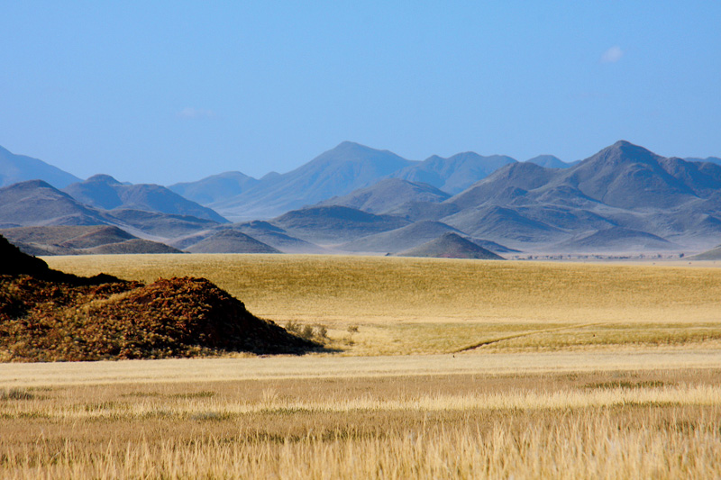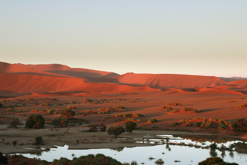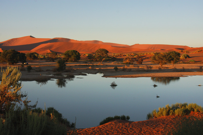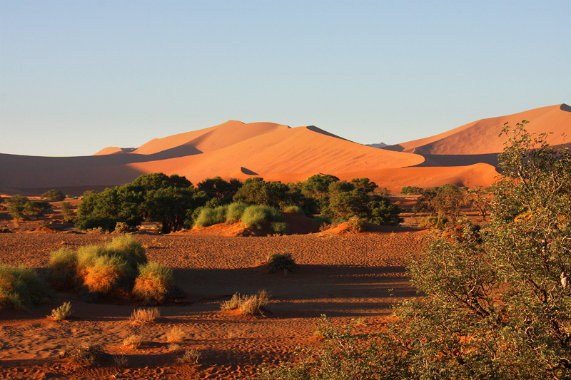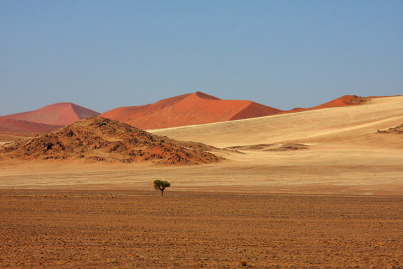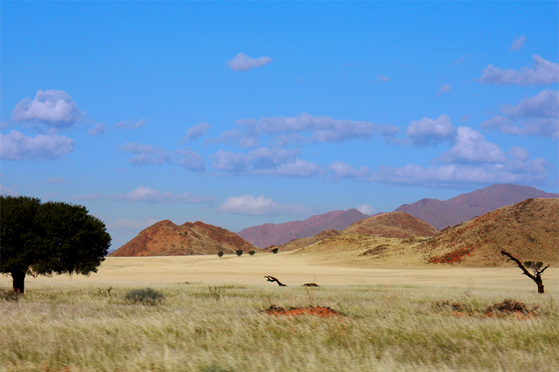 Wie eine cyanfarbene Kuppel überspannt der fast wolkenlose Himmel ein weites Tal, das beiderseits von riesigen Dünen gesäumt wird. Das Himmelsblau bildet einen wundervollen Kontrast zu den roten Sandbergen, deren Flanken von frisch-grünen Gras- und Acanthosicyos-horridus-Büscheln bewachsen sind, auf der Talsohle leuchtet goldgelbes Gras und ab und zu recken sich auch pygmäenhafte, voll belaubte Bäume aus der kargen Ebene empor. Obwohl diese Bäume alles andere als monumental sind, stellen sie trotzdem einen wichtigen Marker dar, der es uns ermöglicht, die wahre Größe der Dünen erfassen zu können – von ihrer malerischen Wirkung mal ganz zu schweigen. Nach einigen Kilometer allerdings beginnt sich die Landschaft zu verändern: während die linke Talseite weiterhin von roten Dünen dominiert wird, schieben sich auf der rechten Seite immer öfter goldgelbe, langgestreckte Sandflanken zwischen die rostfarbenen Hügelketten, kleine Berge aus porösem, braun-rotem Gestein setzen strukturelle Akzente und schwärzlicher Magnetitstaub auf den Dünenflanken irritiert unsere Augen. Die dunklen Anwehungen des körnigen Eisenerzes wirken auf den ersten Blick wie Schatten, doch, und das ist so verwirrend, wie Schatten, die bei diesem Lichteinfall gar nicht möglich sind. Und am Ende des Tals, dem wir uns nun allmählich nähern, tritt eine weitere Material- und Farbkomponente in Erscheinung: wie ein massiver, rötlich-blauer Block riegeln die Ausläufer der Naukluft-Berge die dünengesäumte Senke ab. Schön langsam weiß ich nicht mehr, wo ich zuerst hinsehen soll – die Landschaft ist einfach so reizvoll, so abwechslungsreich, so vielgestaltig, ja, fast verstörend in ihrer Schönheit. Deshalb bin ich richtiggehend erleichtert, als wir endlich das Camp erreichen und ich von der süßen Qual dieser einmaligen Bilderflut erlöst werde.