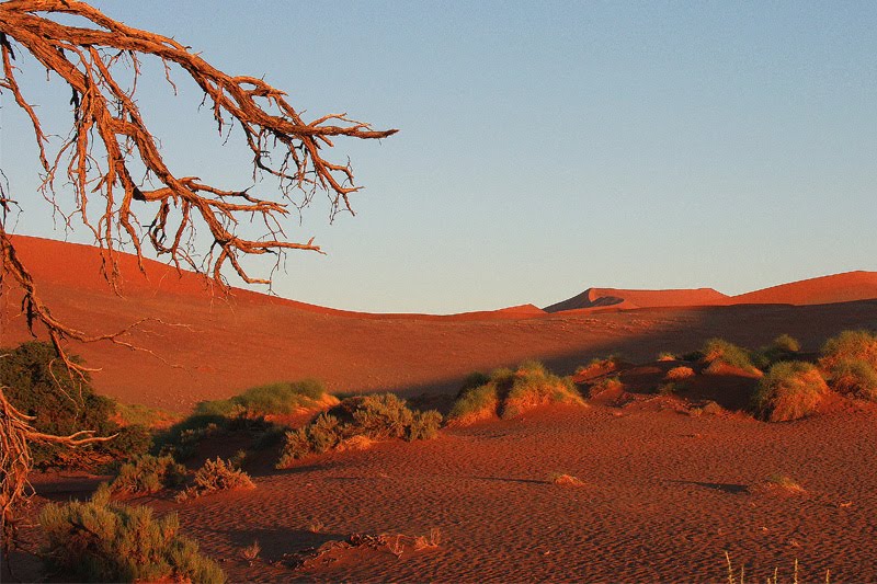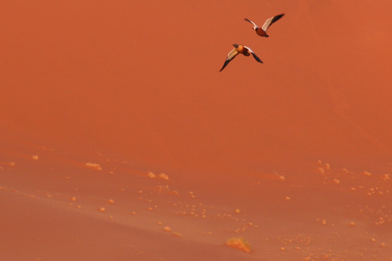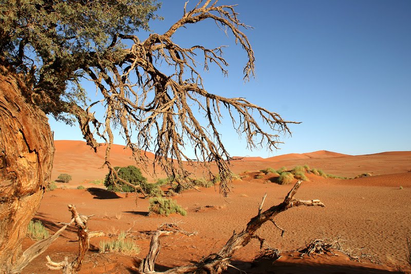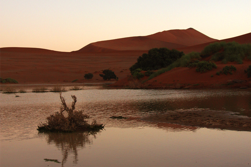 Eine Stille, die nicht hallt, nicht dröhnt, nicht dumpf ist, nicht weh tut, sondern mich umfängt wie Samt, eine Stille, die ihre ganz eigene Geräuschkulisse erzeugt: Sossusvlei, die meist knochentrockene Lehmpfanne, liegt ein ganzes Stück unter mir, ist mit Wasser gefüllt und trotz der Entfernung bilde ich mir ein, das sanfte Schwappen der kräuseligen Wellen am flachen Ufer hören zu können. Ein Gänsepaar überfliegt in großer Höhe den See und ich vermeine, das Singen ihrer schlagenden Flügel wahrzunehmen. Neben meinem rechten Fuß kämpft sich ein kleiner schwarzer Käfer über zebrastreifige Sandwellen und ich bin mir fast sicher, die roten Sandkörner unter seinen Beinchen knirschen zu hören. In Wirklichkeit aber höre ich nichts, absolut nichts. Die Stille ist so intensiv, das Szenario so überwältigend, dass mir meine Sinne ganz einfach einen Streich spielen – allerdings einen sehr schönen, eindringlichen, unvergesslichen. Mein ganzer Körper fühlt sich an, als wäre er mit vibrierenden Rezeptoren bedeckt und ich sauge die Eindrücke, die ich in einem fast rauschartigen Zustand erlebe, begierig in mich auf. Langsam wandere ich über die Flanken kleiner Sandanwehungen, denen der Wind ein absolut ebenmäßiges Rippenprofil aufgebürstet hat, verliere mich in den sandgestrahlten Antlitzen knorriger Wurzeln und Äste, folge den abstrakten Spuren geheimnisvoller Wüstenbewohner und stehe plötzlich vor einem Baum, aus dessen Stamm ein lautes Piepsen ertönt. Und das bilde ich mir jetzt ausnahmsweise nicht ein!