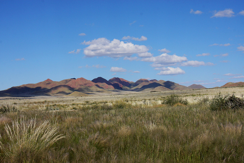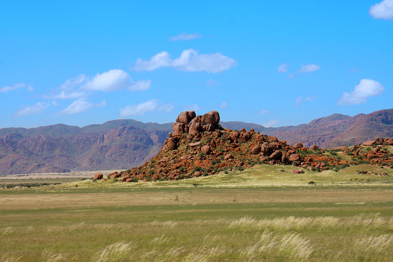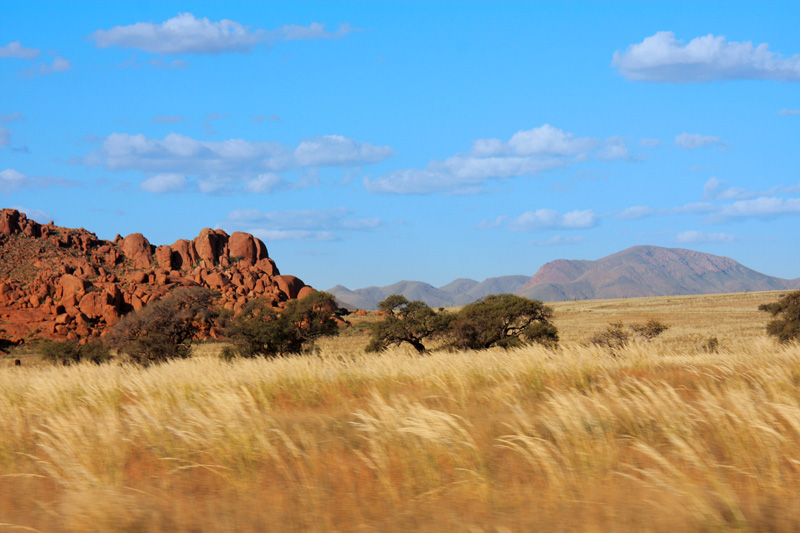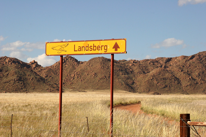 Doch ohne jeden weiteren Zwischenfall erreichen wir bald darauf die von einem Gatter verschlossene Einfahrt zur Farm Koiimasis. 20 Kilometer sind es noch bis zum Farmhaus, das verkündet ein Schild am Tor, nach weiteren 16 Kilometern könne man dann „Landsberg“ erreichen. Heinz amüsiert sich königlich bei dem Gedanken, in der Nähe von Landsberg Quartier zu beziehen – bei uns zuhause nämlich gibt es ebenfalls einen Ort gleichen Namens – dafür aber hätten wir nun wirklich nicht so weit fliegen/fahren müssen, meint er grinsend. Aber natürlich hat sich die Reise auf jeden Fall gelohnt, wie uns allein die wundervolle Landschaft eindrücklich beweist. Auf einer ausgedehnten Ebene wogt weißlich-gelbes Gras, am Horizont staffeln sich hohe Berge in unterschiedlichsten, zarten Blautönen, große Anhäufungen runder roter Felsen liegen, wie von der Hand eines Riesen hingeworfen, immer wieder unvermittelt in der Gegend, riesige Oryx- und Springbockherden ziehen dekorativ durch diese Postkarten-Idylle und ein paar Mal sehen wir sogar Pferde.