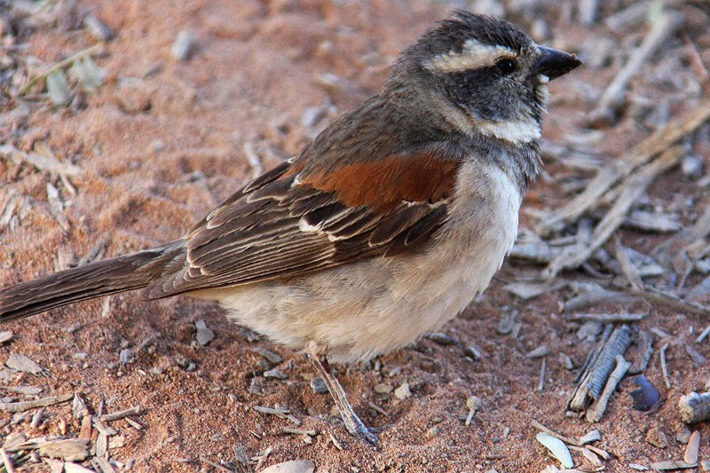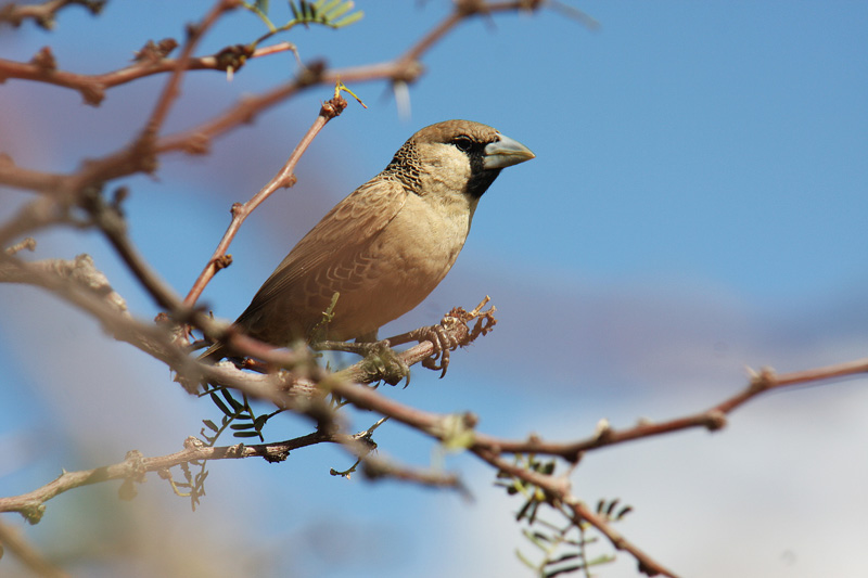 Während wir nun so plaudernd im Schatten sitzen, werden wir von einigen Schildraben und einem größeren Schwarm aufgeregter Kap-Sperlinge belagert, die es ganz offensichtlich auf unser Essen abgesehen haben. Heinz lässt sich erweichen und wirft den gefiederten Gesellen ein Bröcklein seines Apfels hin. Große und kleine Federbälle stürzen sich auf das Obststück, balgen sich ohne Rücksicht auf Verluste, Geschlecht oder gar Körpergröße darum, ein Schildrabe siegt, stellt aber schnell fest, dass Apfel nicht sein Ding ist. Einige Sperlinge übernehmen die verschmähte Beute, doch nach ein paar lustlosen Pickern lassen auch sie das Obst Obst sein, äugen uns ein paarmal noch prüfend an, aber, als kein vernünftiger, schmackhafterer Nachschub folgt, lassen sie uns allesamt links liegen und machen sich auf den Weg zu den nächsten picknickenden Opfern. So schnell ist man unten durch! Doch es gibt Schlimmeres und außerdem wird es für uns ohnehin allmählich Zeit, den Rückweg zum Camp anzutreten. Mit großer Vorfreude auf einen deftigen Brunch schlichten wir uns ins Auto und wühlen uns durch die ersten Kilometer der Tiefsandpad, bis wir plötzlich von einem kleineren Stau gestoppt werden.