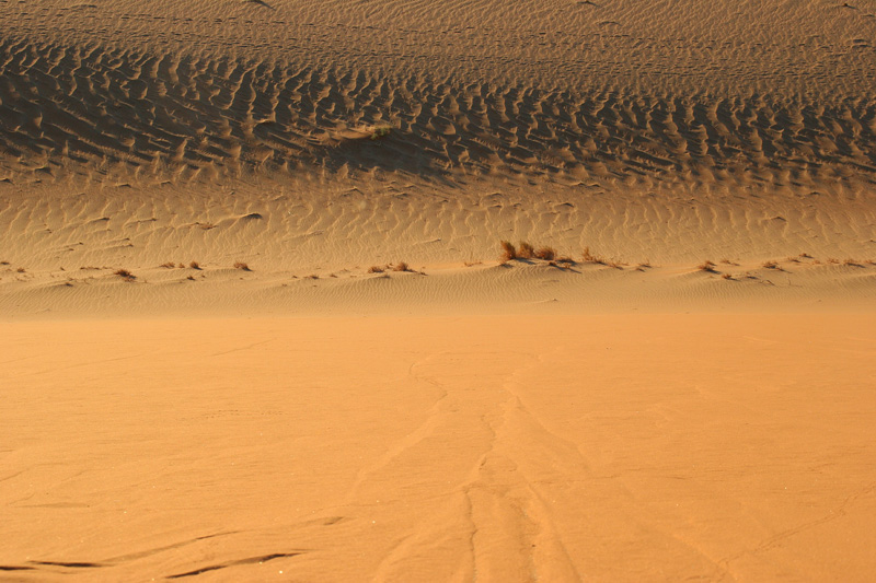 Wir alle können unser Glück kaum fassen (am wenigsten ich), stellen unser Auto auf dem Endstations-Parkplatz am Fuße einer mächtigen Düne ab und steigen rasch aus, um diese Einsamkeit in vollen Zügen zu genießen. Die Insassen des anderen Autos – ein deutsches Pärchen – machen sich zusammen mit Annette und Heinz unverzüglich auf den Weg zur Dünenbesteigung, ich folge den Vieren ein Stück, dann aber bleibe ich stehen und beschließe, mich „abzuseilen“. Ich will die Chance nutzen, diese fast unglaubliche Situation für mich alleine zu haben und lasse die anderen ziehen. Annette, die sich auf den ersten hundert Metern noch munter plaudernd mit dem Pärchen unterhalten hatte, geht beim weiteren Anstieg offenbar schön langsam die Puste aus, das Gespräch verklingt, verstummt und es kehrt eine Stille ein, die kaum zu beschreiben ist.