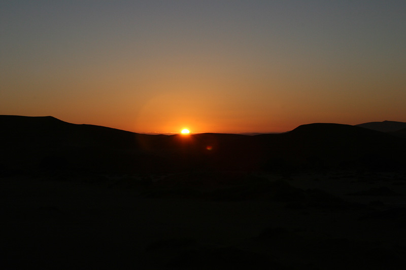 Doch plötzlich verschwinden mindestens 95 Prozent der Glühaugen des Autowurms links vor uns im Nichts – ich habe eine scharfe Kurve im Verdacht – wie von Zauberhand eliminiert, wie von einem unsichtbaren Strudel eingesogen. Verantwortlich dafür ist tatsächlich eine Kurve, aber eine, die nur die anderen gefahren sind: sie sind auf den Parkplatz der Düne 45 abgebogen, um nur ja nicht den Sonnenaufgang zu verpassen, drängen sich dort in engen Parkreihen aneinander, während wir nun, relativ gesehen, fast alleine die letzten zwanzig Kilometer in Angriff nehmen dürfen. Allerdings traue ich dem Entvölkerungs-Frieden nicht so recht und werfe zur Sicherheit minütlich prüfende Blicke in den Rückspiegel – aber die unzähligen Artgenossen in ihren rumpelnden Blechkisten bleiben, wo sie sind, niemand folgt uns. Heißa, sicher wuseln gleich Heerscharen freudig erregter Zweibeiner in einer ameisenähnlichen Kolonne den Grat der klassischen Sonnenaufgangsdüne nach oben und finden das Gewimmel ganz toll. Sollen sie mal; auch ich kann nicht leugnen, dass mir diese Tatsache ausnehmend gut gefällt – die Absenz der anderen Touris ist wie Balsam auf meiner Seele, wie ein hochwirksames Antihistaminikum für meine Massentourismus-Pusteln; meine Beklemmungen legen sich und ich entspanne mich zunehmend. Eine geradezu euphorische Stimmung aber überkommt mich, als wir den 4×4-Shuttle-Parkplatz passieren und jetzt auch noch alle restlichen Autos dort zurückbleiben. Lediglich ein letzter Mitstreiter wühlt sich als einziger vor uns durch den bisweilen recht tiefen Sand, ansonsten sind wir nun wirklich alleine auf weiter Flur.