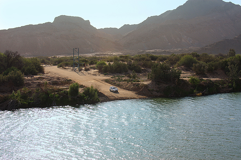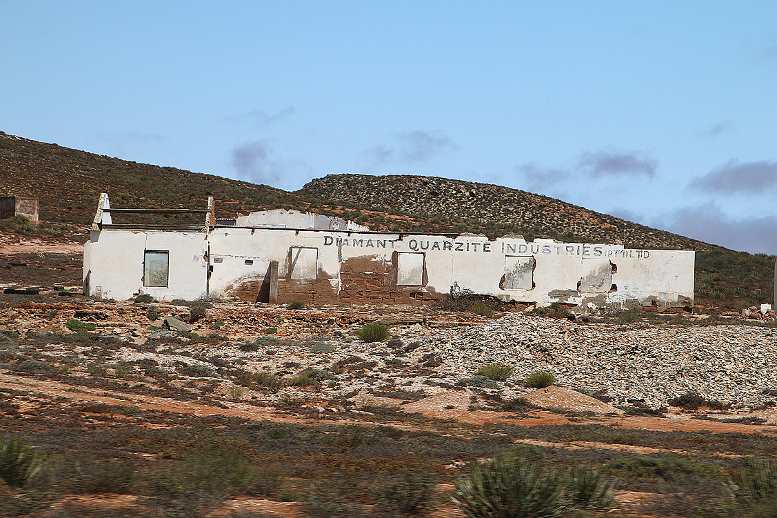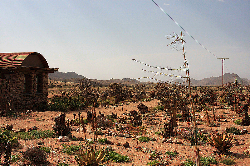 Lange Zeit führt die Straße nun schnurgerade auf einer recht öden Teerstraße, parallel zur Küste, dahin, bis sie kurz vor dem Grenzstädtchen Alexander Bay nach rechts abbiegt und bald darauf zur Gravelroad wird, die noch trostlosere Gegenden durchschneidet. Abgestorbene Eukalyptusbäume, nackte Abraumhalden, schwere Minenfahrzeuge, der örtliche Schlachthof und windgebeutelte Farmen inmitten dieser von Menschen verwüsteten Landschaft, wo man, sprich ich, nicht mal tot über den gelegentlich sehr präsenten Zäunen hängen möchte. Die von Süden kommende Zufahrt zum Richtersveld NP ist wahrlich eine an die Nieren und das Gemüt gehende Tortur! Doch schließlich haben wir auch das geschafft – die Berge des südwestlichen Richtersvelds tun sich in nachmittaglichem Dunst vor uns auf, wir biegen links davor ab, passieren noch diverse, weniger schöne Minengebiete an der Parkgrenze, bis wir bald Helskloof Gate hinter uns haben und endlich-endlich in Sendelingsdrif ankommen! Pah, ist das jedes Mal eine nervtötende Strecke…