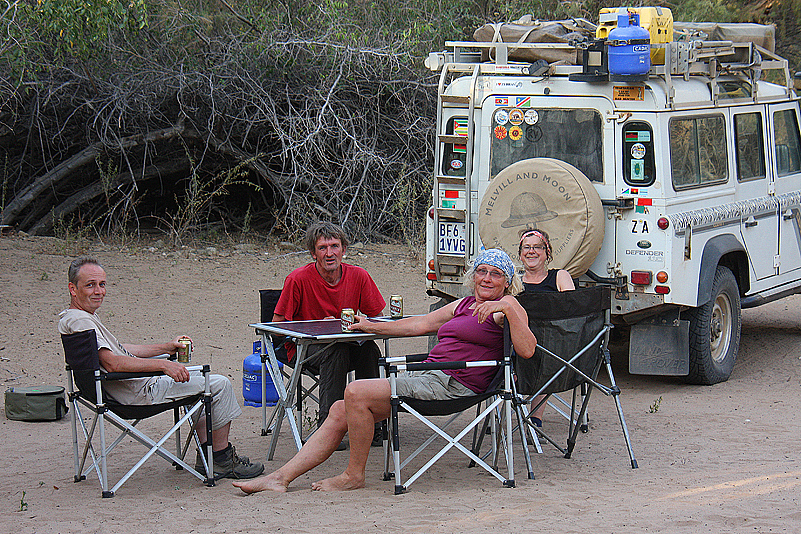 Zum jetzigen Zeitpunkt sind wir zwar noch immer nicht am Ziel unserer Träume, doch es ist zumindest in greifbare Nähe gerückt. Rasch checken wir gegen 16 Uhr am Hauptgate ein, voller Vorfreude – sogar auf das verbuschte Potjiespram – und nehmen eine dreiviertel Stunde später, mit allen Papieren ausgestattet, die Reststrecke von knapp zehn Kilometern zum heutigen Tagesziel in Angriff. In der beginnenden Dämmerung schließlich laufen wir ein. In Potjiespram, einem zugewachsenen, nicht besonders reizvollen Camp direkt am Oranje. Man hört den Fluss rauschen, die Sanitäreinrichtungen sind gepflegt, man ist relativ einsam – wahrscheinlich aber auch nur, weil es hier so unansprechend ist… Wir können uns deshalb auch einfach und konkurrenzlos die einzig akzeptable Campsite greifen, wo wir sogar vereinzelte Vögel entdecken, nebst ein paar interessanter Insekten und zahlreicher Ziegen der Nama, die überall ihren Kot hinterlassen. Auch übergriffig-diebische Meerkatzen-Banden treiben hier, wie immer gerne ihr Unwesen – aber egal, denn wir sind im Richtersveld – und das ist das einzige, was zählt. Wir sind da – und morgen dringen wir in die wirklich interessanten Tiefen dieses einmaligen Gebietes vor. Das ist Heinz und mir Trost genug. Und auch unsere drei Freunde sind glücklich über unsere Ankunft im legendären Richtersveld, glücklich über einen verdienten Feierabend an einem rauschenden Fluss, an dem man vor lauter Dunkelheit ohnehin nichts mehr sehen kann, über unsere rasch errichteten Zelte, das gemütliche Abendessen und die einsame Nacht, deren vertraute Naturgeräusche uns sehr bald in einen wohlig-erschöpften Schlaf lullen. Was uns morgen erwartet? De Hoop, das schönste aller flussnahen Richtersveld-Camps – und der Weg da hin – so habe ich es bisher erlebt und empfunden. Was uns morgen wirklich erwartet? Wie gut, dass ich das heute Abend noch nicht im Geringsten erahne – zumindest die Situation in De Hoop…