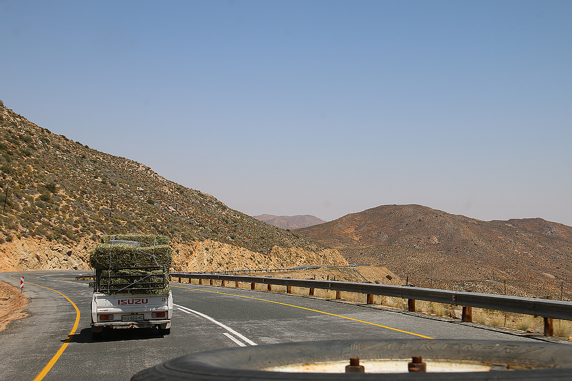 Nach anderthalb Stunden langen tauchen auch endlich Annette und Jochen aus den Tiefen des Spar Markets wieder auf und rollen mit zwei übervoll bepackten Einkaufswägen auf uns zu. Oh je, das muss nun alles verstaut werden… Schwitzend klamüsern wir die erworbenen Lebensmittel nach ausgeklügelten Sortierkriterien auseinander und schlichten, logistisch möglichst sinnvoll, Stück für Stück in Kühlschränke, Kisten, Netze und Kartons. Als endlich alles drin ist, geht es ab zum Drankwinkel (Getränkeladen mit alkoholischem Sortiment), um dort die Sundownervorräte aufzustocken, für die wir wohlweislich genügend Stauraum freigelassen haben. Puh, geschafft! Wir klettern an Bord und rollen zwei Parkplätze weiter, rüber zu einem Take Away. Dort versorgen wir uns rasch mit fettig-heißen Samosas, gefüllten Teigtaschen, die trotz unterschiedlichen Inhalts allesamt relativ gleich schmecken und auch kulinarisch keine große Offenbarung darstellen. Aber was soll’s – satt machen die Dinger jedenfalls, und in Kombination mit einem extrem zuckerhaltigen Kaltgetränk sind sie auch schnell runtergespült. Der Energiehaushalt ist also wieder im Plus, der Magen beschäftigt und wir können weiter. Hurtig verlassen wir so Springbok, um unbedingt noch vor Einbruch der Dunkelheit im Richtersveld NP anzukommen.