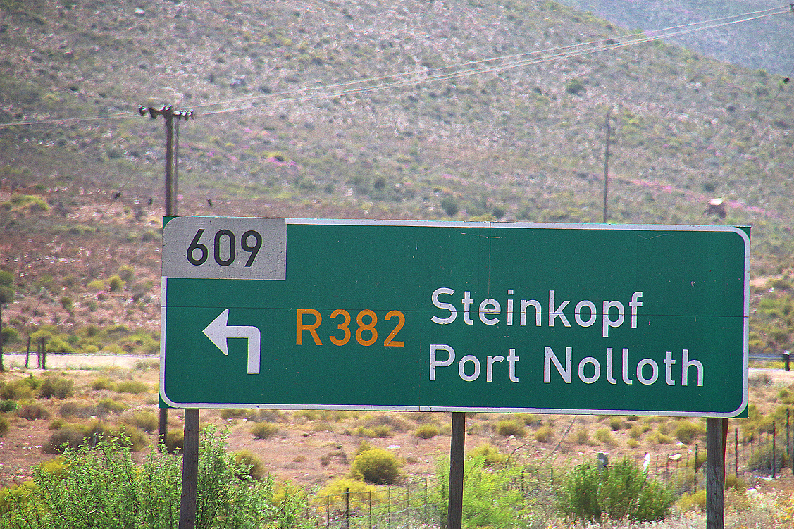 Also nix wie rauf auf die N7, Richtung Norden, links abbiegen in Steinkopf, hoch auf den Anenous Pass, Pinkelpause an einem vermüllten Parkplatz, auf der anderen Seite des Passes wieder runter und dann immer geradeaus, nach Port Nolloth. Die wirklich öde Strecke, die so öde gar nicht wäre – könnte man nur die Landschaft links und rechts der Straße zu Fuß erkunden – zieht sich endlos. Eine entzückende Abwechslung allerdings bieten zahlreiche brütende Schildraben, die mit hingebungsvoll geneigten Köpfchen in ihren Nestern sitzen, die sie offenbar mit Vorliebe in den Kehlungen der Stromleitungs-Isolatoren errichten. Es rührt mich zutiefst, die neugierigen, manchmal auch streitbaren, aber stets taffen Rabenvögel so versunken und liebevoll auf ihren Nestern sitzen zu sehen. Und manchmal erspähen wir sogar schon Nachwuchs – spärlich befiederte Köpfchen mit weit aufgerissenen Schnäbeln recken sich wackelig über die Nestränder hinaus und warten auf Futter. Wie gerne würde ich jetzt aussteigen, auf so einen Mast klettern und die Vögelchen liebkosen! Aber, so fürchte ich, würde ich mich da weder bei meinen Mitreisenden noch bei den Rabeneltern sonderlich beliebt machen… Also bleibt es bei dem herzerwärmenden Gedanken, der mir jedoch die weitere Fahrt nach Port Nolloth erheblich versüßt – so vergeht die Zeit auf jeden Fall rascher und angenehmer.