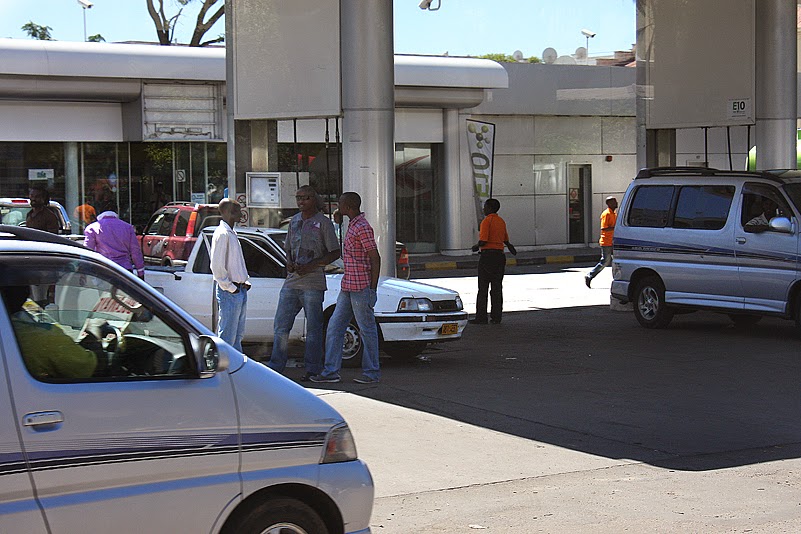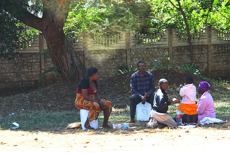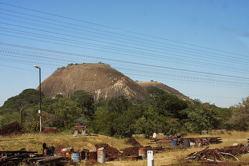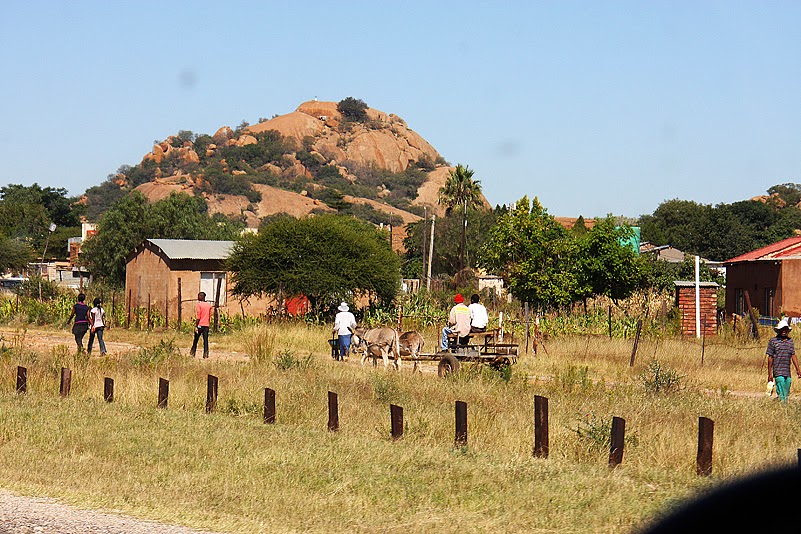 Etwas bedröppelt und gleichzeitig zutiefst erleichtert, stellen wir die Fotografiererei auf den nächsten, langen Kilometern sicherheitshalber weitestgehend ein. Was auch nicht schwer fällt, denn es gibt wenig Interessantes zu sehen; allenfalls die markanten Felsformationen, die uns zeigen, dass wir gerade auf Höhe des Matopos Nationalparks dahinbrausen und ein paar Hügelflanken, die von unglaublich dichten Euphorbien-Wäldern bewachsen sind. Mann, so ein Fahrtag geht echt an die Nieren – und die Nerven! Es ist nun schon mehr als High Noon, wir haben zirka die Hälfte der Tagesstrecke hinter uns, als sich ein weiteres Organ meldet: der Magen. Wir haben tierisch Hunger und steuern deshalb das nächstgelegene Kaff, das eine Stillung dieses Bedürfnisses möglich machen könnte, an. Gwanda heißt der Ort der Wahl. Wir müssen nicht mal ins Zentrum fahren, sondern finden, direkt an der Hauptstrasse gelegen, ein Einkaufszentrum inklusive der üblichen Fast-Food-Etablissements, die anscheinend auf der ganzen Welt untrennbar mit Malls verknüpft sind. Wir rangieren also auf den Parkplatz und fühlen uns gleich wieder unwohl: die Geschäfte haben offensichtlich fast alle geschlossen, Jugendliche in abgerissenen Westklamotten lungern zuhauf herum, konsumieren undefinierbare Getränke und seltsam riechende Rauchwaren – und sehen uns neugierig an. Neugierig auf eine Art und Weise, die schwer einschätzbar ist… Deshalb machen wir mal wieder einen auf Arbeitsteilung: Annette sondiert das dürftige Angebot, nimmt unsere Bestellungen entgegen (Pommes mit Burger bzw. Chicken Wings oder Chicken Wings bzw. Burger mit Pommes), dann nimmt sie Jochen als Begleitschutz mit, während Heinz und ich beim Auto bleiben. Ereignislos verstreichen die Minuten, bevor unsere Freunde wiederkehren. Lustlos verzehren wir anschließend das mitgebrachte Essen, machen die Motorhaube zum Stehtisch, bringen es hinter uns. Der vorletzte Schluck Cola rinnt meine Kehle hinab und eigentlich könnten wir uns jetzt wieder auf den Weg machen. Wäre da nicht das leidige Blasenproblem… Und Zimbabwe ist nicht Südafrika oder Namibia, wo man einfach mal unterwegs anhalten und unbehelligt strullern kann. Nein! Hier sind immer und überall Menschen unterwegs. Wie aus dem Nichts tauchen sie selbst da auf, wo man denkt, alleine zu sein. Das wollen wir, zumindest wir Frauen, nicht riskieren.