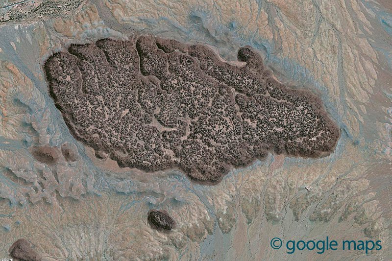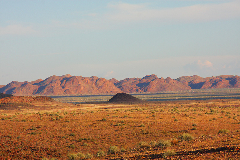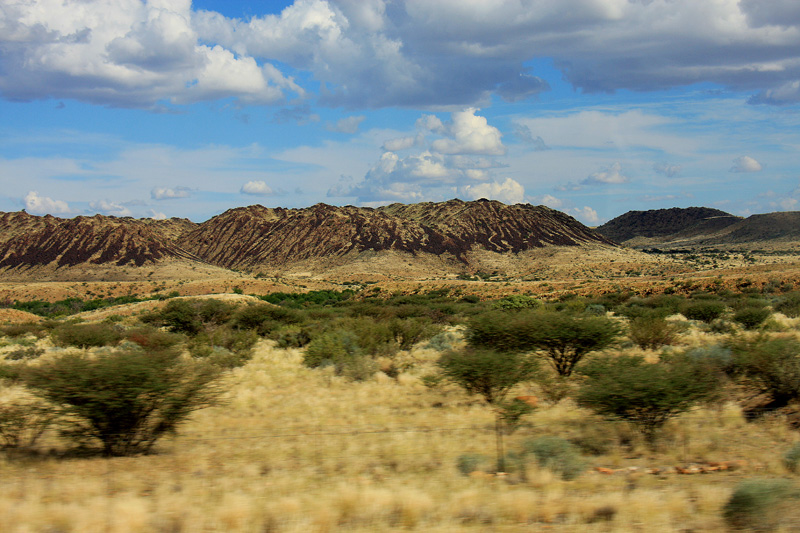 Ein paar Kilometer weiter taucht am südlichen Horizont noch etwas Interessantes auf: eine Bergkette, deren einzelne Erhebungen allesamt wie kleine Vulkane aussehen. Schwarze Gesteinsadern umklammern die Kuppen wie dicke Spinnenbeine, wirken aus der Ferne wie erstarrte Lavaströme – und ich schlage sofort erneut mein Buch auf. Leider aber wird diese extrem auffallende Formation mit keinem Wort erwähnt; kein Name, keine Erklärung, nix! Keetmanshoop Dolerit-Komplex, früher Jura, das ist alles, was ich herausfinde. Dieses Informations-Vacuum lässt mir natürlich keine Ruhe und, als ich wieder zuhause bin, beginne ich sherlockmäßig zu recherchieren, bringe das Internet zum Glühen, lade mir einschlägige Dissertationen herunter, bitte sogar die Geological Society of Namibia um Hilfe, komme aber nur in winzigen Schritten voran. Irgendwie will mir das nicht in den Kopf. Dieser Bergstock, der etwa fünfeinhalb Kilometer lang und gute zwei Kilometer breit ist und aus der Luft wie ein erhabener, bösartiger Leberfleck aussieht, ist so markant, dass er doch zumindest einen Namen haben muss! Doch Fehlanzeige. Erst eine Buchempfehlung der Geologischen Gesellschaft bringt Licht in mein Dunkel: es handelt sich um eine ehemals unterseeische Schwelle, die durch tektonische Vorgänge aufgewölbt und von Gesteinsgängen aus Dolerit durchsetzt wurde – das sind die schwarzen „Spinnenbeine“. Nördlich von Keetmanshoop existierte einstmals eine zweite derartige Schwelle, sie aber ist vor Langem schon komplett der Erosion anheim gefallen, da sie von einer weicheren Sedimentkruste bedeckt war als die, die wir hier vor uns sehen. Danke, Kaarina von der Geological Society of Namibia! Jetzt bin ich wieder mit meinem Recherche-Schicksal versöhnt – zumindest fast. Denn auch die nette Geologin konnte mir leider keinen Namen für dieses steinerne Muttermal nennen; kurzerhand taufe ich es deshalb das „Gobas Jura-Melanom“ und bin nun – Monate später – endgültig zufrieden…