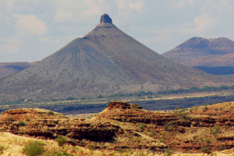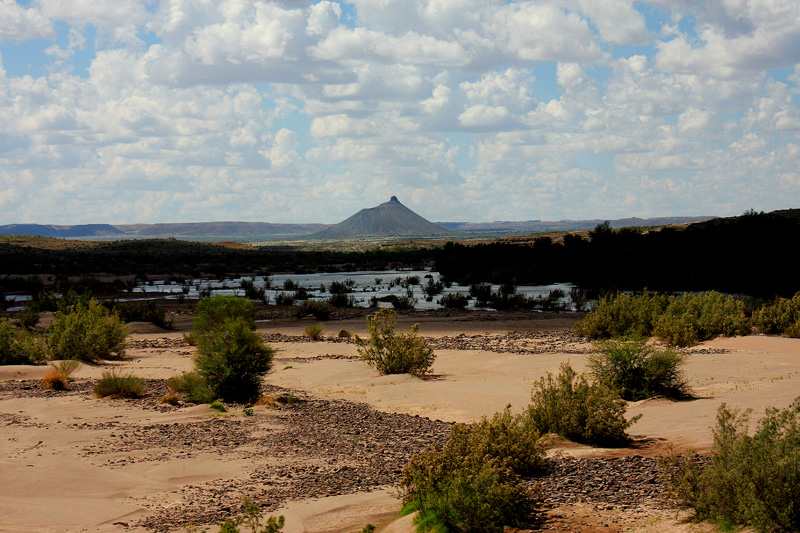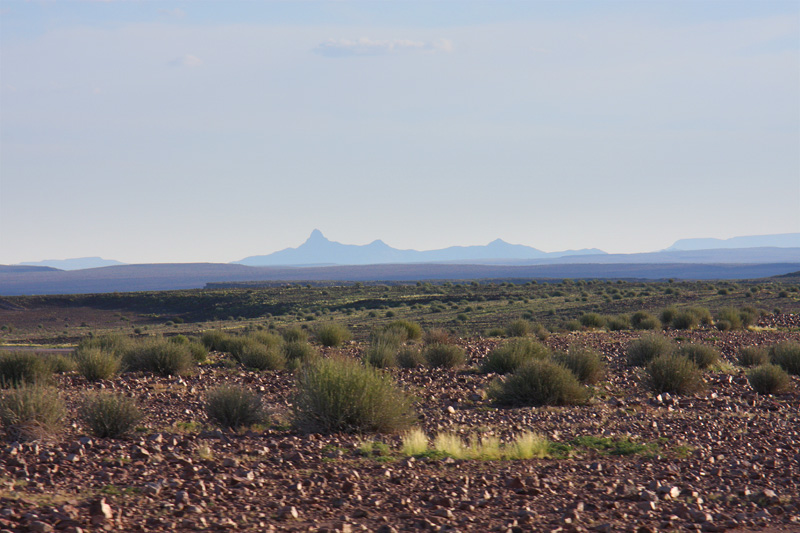 Wir brausen deshalb an der Abzweigung zum Fish River Canyon vorbei und nehmen die zusätzliche 44-Kilometer-Strecke in Angriff, die sich abermals als extrem kurzweilig erweist, da es erneut einige geologische Schätze zu sehen gibt. Gleich nach der Brücke zum Beispiel, am nordöstlichen Horizont, schiebt sich ein markanter Berg in unser Blickfeld: es ist der Schlangkopf, den ich unter Zuhilfenahme meiner neu erworbenen Kenntnisse sofort als typischen Zeugenberg identifiziere. Sein Gipfel wird von einem kecken Doleritmützchen geschützt, das die darunter liegenden Gesteinsschichten vor Erosion bewahrt hat. Doch im Gegensatz zu den tafeligen Zeugenbergen von vorhin ist der Schlangkopf ein nahezu symmetrischer Kegel, der mit seinen sanften Flanken und dem Doleritkäppchen an eine weibliche Brust erinnert. Naja, der Nippel ist ein wenig groß, aber sonst…