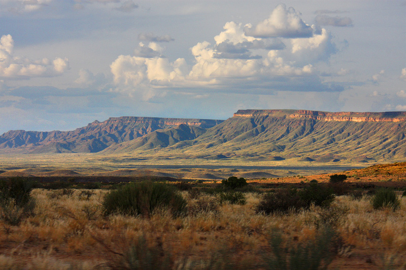 Sedimentablagerungen auf dem Kalahari-Kraton, Festlandsockel kaum durch die tektonischen Kräfte der Damara-Gebirgsbildung beschädigt, Schichtstufe der Schwarzrand-Untergruppe, metamorphe Gesteine, Tonschiefer, Erosion, Denudation, Deflation, Zeugenberge – so steht in meinem Buch furztrocken geschrieben. Aha, soso, denke ich mir etwas gelangweilt und verstehe nur Bahnhof, als justament in diesem Augenblick Berge an uns vorbeiziehen, die sich deutlich aus der relativ ebenen Landschaft erheben und, offensichtlich geschützt durch einige dunkle, harte Gesteinsschichten kurz unterhalb der flachen Gipfel, der flächenhaften Abtragung (ist gleich Denudation und Deflation) widerstanden haben. Hah, da haben wir sie doch, die soeben erwähnten Zeugenberge! Kurz darauf, die Straße fräst sich gerade durch einige flache Hügelketten, erhalte ich die nächste geologische Erhellung: rechts und links von uns türmen sich schwarz-grüne Schieferplatten-Stapel auf; es sind quasi die durch den Straßenbau verursachten, nun sichtbaren Wundränder jener Sediment-Gesteinsschichten, deren dunkle Farbe dem Schwarzrand zu seinem Namen verholfen haben. Angesichts ihres wellenartigen Schichtungsverlaufs kann man sich die tektonischen Vorgänge, die zur Aufwerfung des Tonschiefers geführt haben, plastisch vorstellen und der trockene Buchtext klingt mit einem Mal viel lebendiger. Begeisterung beginnt sich in mir zu regen. Begeisterung darüber, dass ich etwas, was mir vorher wahrscheinlich entgangen wäre, nun mit völlig anderen Augen sehen kann. Und auch Begeisterung über die stille Schönheit der ebenmäßigen Schieferplatten, deren Farbe trotz des mittlerweile recht bedeckten Himmels förmlich leuchtet und deren Struktur einladend samtig wirkt. Mhm, mit diesen Platten könnte man prima einen Fliesenhandel eröffnen und wunderschöne Naturbäder gestalten; es muss ja nicht immer Koiimasis-Granit sein…