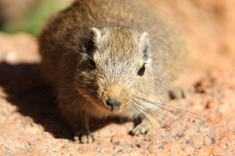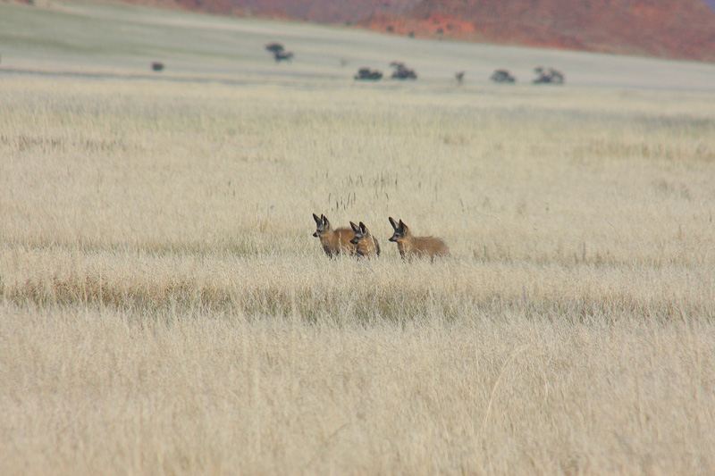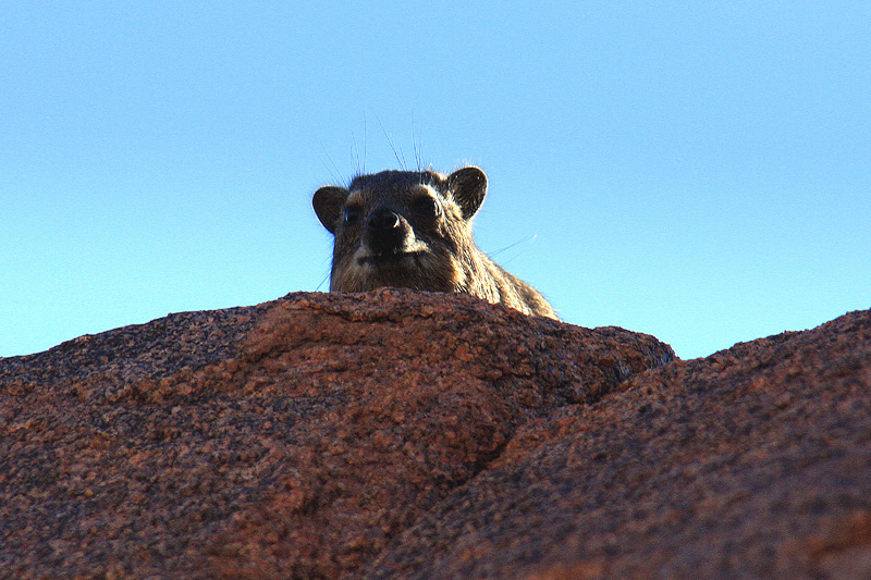 Und täglich grüßt das Murmeltier. Nein, in diesem Falle sind ausnahmsweise die Klippschliefer dafür zuständig, ansonsten aber gestaltet sich unser Morgen wie auch schon der gestrige. Früh sind wir auf den Beinen, alle Zaungäste versammeln sich und unter deren wachsamen Augen setzen wir die, zugegebenermaßen, nicht ganz uneigennützige Bröselproduktion in Gang. Nach dem Frühstück allerdings folgt heute kein süßer Müßiggang, sondern der Abbruch unseres Lagers, denn eine weitere Tagesetappe steht bevor: 380 Kilometer Schotter- und Teerpiste bis zum Hobas Camp am Fish River Canyon. Das ist zwar keine Monster-Distanz, aber Zeit zum Trödeln haben wir auch nicht wirklich, weshalb wir gleich zügig loslegen. Schnell ist unser Hab und Gut gepackt und im Auto verstaut, etwas wehmütig verabschieden wir uns dann von dem luxuriösen Duschgemach, von den bestöpselten Waschbecken, von dem wundervollen Blick in die Landschaft und natürlich von all unseren neuen Freunden – den Klippschliefern, den Felsenratten, den Käfern und den hungrigen Vögeln, die nun bis auf Weiteres ihr karges Dasein ohne unsere Brosamen werden fristen müssen. Bevor wir jedoch endgültig ins Auto klettern dürfen, erhalten wir noch Besuch von zwei Baumhopfen mit glänzendem Gefieder und ein Verreaux-Adler zieht seine Good-Bye-Kreise über uns; dann aber schaffen wir es doch, uns loszueisen. Gegen 10 Uhr (immerhin) erreichen wir das Farmhaus, bezahlen und nehmen noch ein feines Stück Wild-Filet für heute Abend mit an Bord.