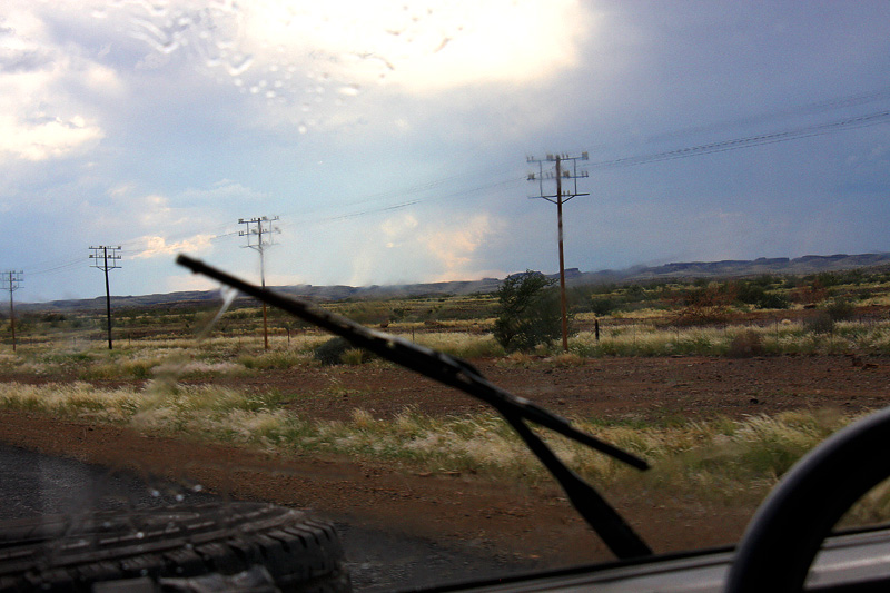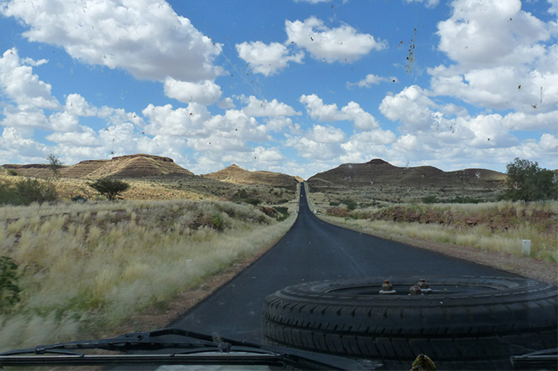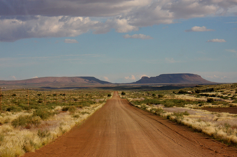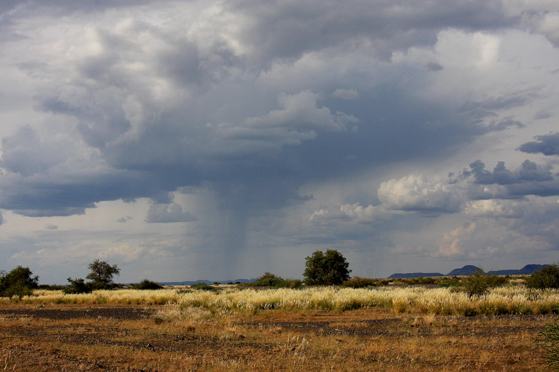 Im Augenblick jedoch bleibt uns nichts weiter, als die augenfälligen Berge als weiteren Punkt auf der Recherche-Liste zu vermerken, dem Keetmanshooper Postamt einen bedauernden Blick zuzuwerfen und den erforderlichen Einkauf hinter uns zu bringen, bevor wir nach getaner Arbeit die 44 Kilometer wieder zurückheizen – mitten hinein in ein üppiges Gewitter. Da wir kurz vor Erreichen der Unwetter-Kernzelle auf die C12 abbiegen, prasseln zwar nur dessen Ausläufer auf uns herab, sonderlich begeistert aber sind wir sind trotzdem nicht. Hatten wir nicht gesagt, wir wollen keinen Regen in diesem Urlaub?! Unser Wunsch scheint allerdings nicht in Petrus Gehörgang angekommen zu sein, denn rings um uns herum türmen sich hohe Cumulonimbus-Gebilde, deren abgeplattete Unterseiten deutlich das in den Wolkenbergen schlummernde Gewitterpotential signalisieren. Doch vielleicht tun wir dem armen Petrus auch Unrecht; vielleicht sind dies ja vielmehr die Vorboten von Einschiehs Rache, die uns nun, weil wir ihr nicht geglaubt hatten, schlechtes Wetter auf den Hals hetzt? Wir trauen dem besserwisserischen Plaudertäschchen fast alles zu (wenn auch mit einem Augenzwinkern) und geben deshalb ordentlich Gas, um dem Rachegewölk möglichst rasch zu entkommen. Ein paar Kilometer weiter werden wir jedoch auf unserer Flucht rüde ausgebremst: mitten auf der Schotterstraße stehen zwei große Schilder, auf denen ein unmissverständliches „Road closed“ prangt. Nein, nein und nochmals nein, das darf nicht wahr sein! Fassungslos stürzen wir aus dem Auto und, während wir die Reifenspuren zwischen den beiden Blechtafeln unter die Lupe nehmen, rattern bereits düstere Gedanken über zeitintensive Alternativrouten und massig Zusatzkilometer durch unsere Köpfe. Mhm, tja, leider ist nicht ganz eindeutig zu erkennen, wie frisch die deutlich sichtbaren Reifenabdrücke wirklich sind, aber so richtig uralt sehen sie auch nicht aus. Sollen wir es riskieren? Ein Blick auf die Karte zeigt, dass der einzig kritische Streckenabschnitt eigentlich nur die wenige Kilometer entfernte Durchquerung des Löwenflusses sein kann und ja, das können, das müssen wir riskieren! Immerhin besteht die Möglichkeit, dass die Furt schon wieder passierbar ist und die Schilder schlichtweg noch nicht abgeholt wurden. Und wenn nicht, dann haben wir zumindest nicht allzu viele Kilometer verschwendet, müssen wir uns ohnehin etwas anderes überlegen.