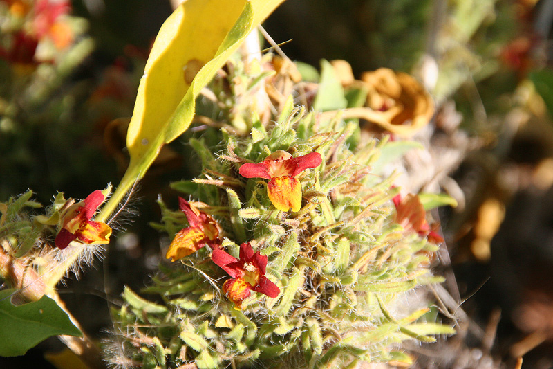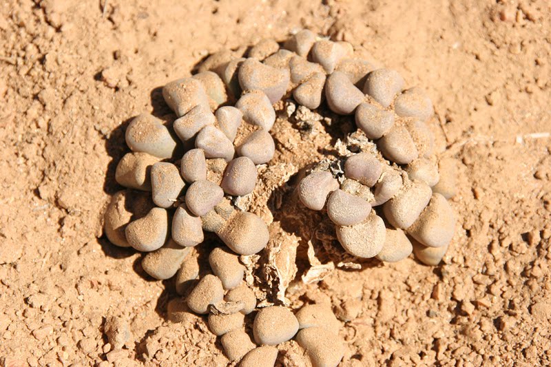 Nun steht unserer Abreise nichts mehr im Wege, so denken wir jedenfalls, aber allein für die lumpigen zwanzig Kilometer bis zur D707 benötigen wir mal wieder über eine Stunde. Ein paar rehäugige Steinböckchen springen über die wogende Ebene und wollen beobachtet werden, genauso wie auch die Horde fröhlicher Löffelhunde, die übermütig durchs hohe Gras tollt und dabei unseren Weg kreuzt, außerdem klettern in den Felsen lautstarke Paviane umher und lenken ebenfalls unsere Aufmerksamkeit auf sich. Okay, da wir nun ohnehin schon wieder angehalten haben, können wir doch gleich zudem noch die örtliche Botanik unter die Lupe nehmen, nicht wahr?! Und die präsentiert uns alte Bekannte, aber auch Neues: Sesamum triphyllum zeigt freizügig seine uns bereits vertrauten Kelche; saftige, rosarote Malvenblüten recken ihren pink gestreiften Flor der Sonne entgegen, die rostrot-gelben Blüten des Petalidium setosum hingegen sind bereits etwas vertrocknet, so dass wir nicht in den vollen Genuss der wunderschönen, bunten Blumenbällchen kommen, die für das Acanthus-Gewächs so typisch sind. Auch die Rogeria longiflora begegnet uns erneut, in diesem Falle jedoch in unbelaubtem Zustand und ohne Blüten; dafür aber strotzen die holzigen Stängel vor Samenständen. Genau die hatten wir bei unserem letzten, prächtig blühenden Exemplar auf dem Welwitschia Drive vermisst und freuen uns deshalb tierisch, die hartschaligen Kapseln, über die wir schon einiges gelesen haben, endlich persönlich in Augenschein nehmen zu können. Diese hübschen Gebilde nämlich – mit ihrem Doppelgehörn und der leicht aufgebogenen Spitze wirken sie ein bisschen wie Aladins Hauspantoffeln – bergen ein faszinierendes Geheimnis: die Kapseln bestehen aus je zwei Samenkammern; die erste wird gleich nach dem Ausreifen der Saat in die Umgebung entleert, die zweite hingegen, sie enthält etwas weniger Samen, verbleibt geschlossen an der trockenen, toten Pflanze, bis die Kapsel so verwittert ist, dass auch sie die Saat freigibt. Durch dieses raffinierte Dosierungskonzept wird unnötige Konkurrenz unter den Sämlingen vermieden. Der Verrottungsprozess jedoch kann Monate, ja, sogar Jahre dauern – eine Zeitspanne, die der Inhalt idealerweise unbeschadet überleben sollte: mit der extrem harten Schale des Samenstandes, dessen unglaublicher Stabilität und den beiden spitzen Hörnern schützt die Pflanze ihre Keimzellen vor allzu gierigen Fressfeinden, bis die richtige Zeit gekommen ist, sie in die Botanik zu entlassen. Natürlich testen wir die in Büchern beschriebene Unkaputtbarkeit gleich vor Ort – und die Hülsen erweisen sich tatsächlich als so widerstandsfähig, dass es uns nicht gelingt, sie ohne schwereres Werkzeug zu öffnen und in ihr Innerstes zu spähen. Doch ob nun mit oder ohne diesen Beweis: derart ausgefeilte Arterhaltungsstrategien fesseln uns mit ihrer Simplizität und Funktionalität, versetzen uns jedes Mal wieder in Erstaunen und unsere Achtung vor der Natur steigt stets noch ein wenig mehr.