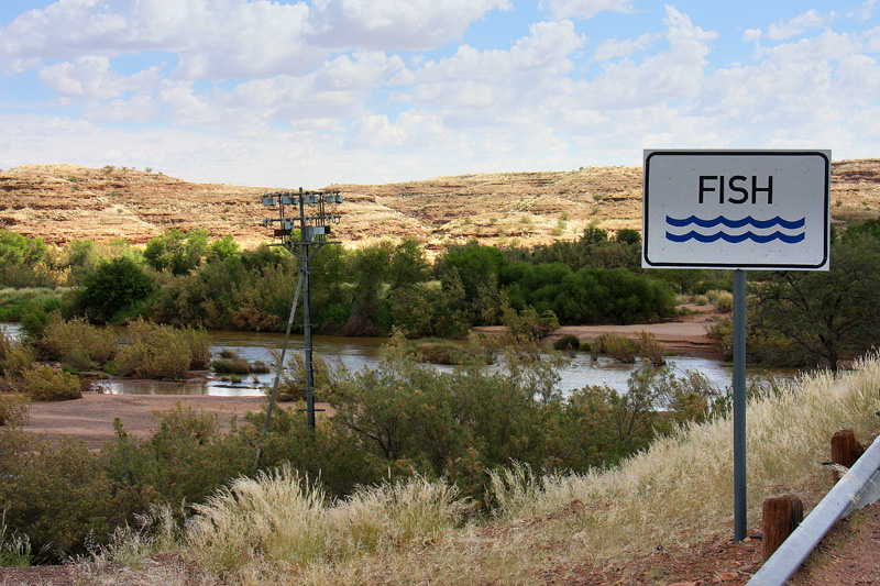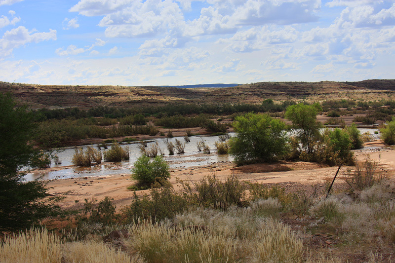 In Gedanken entwerfe ich gerade meinen persönlichen Badetempel, als mich ein erneuter Landschaftswechsel aus meinen Tagträumen reißt. Eine Senke tut sich vor uns auf, eine Brücke führt über einen trüben Fluss und ich stelle nach Konsultation der Karte erstaunt fest, dass wir doch tatsächlich schon Dreiviertel der langen Strecke nach Keetmanshoop hinter uns gebracht haben und soeben am Fish River angekommen sind. Sieh einer an – so schnell können Kilometer fliegen, wenn graue Zellen und Augen gleichermaßen beschäftigt sind! Langsam überqueren wir die Brücke, kurven an den Straßenrand und nutzen die Gelegenheit, uns ein wenig die Füße zu vertreten, während wir die deutlich zurückgegangenen, aber immer noch reißenden Fluten bewundern. Allerdings sind wir mittlerweile vom Anblick fließender Gewässer schon so übersättigt, dass wir dieser eigentlichen Sensation nur so lange Aufmerksamkeit schenken, bis unsere Beine wieder entspannt sind und wir den Weg fortsetzen können. Ursprünglich wollten wir ja nun bei Seeheim auf die C12 abbiegen, aber wahrscheinlich – das dämmerte uns bedauerlicherweise erst kurz nachdem wir Aus verlassen hatten – wird sich uns die nächsten fünf Tage keine Möglichkeit mehr bieten, unsere Vorräte aufzustocken. So also liegt, im wahrsten Sinne des Wortes, nichts näher, als jetzt noch einen Abstecher ins 22.000 Einwohner zählende Keetmanshoop zu machen und dort einen Supermarkt zu plündern.