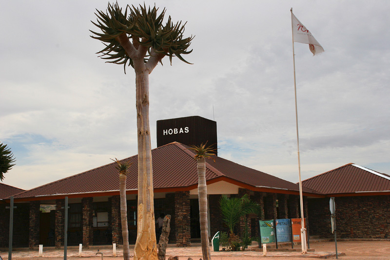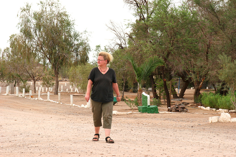 Heute aber haben wir noch knapp 40 Kilometer bis Hobas vor uns, die sich durch die optische Ereignislosigkeit unserer Umgebung zwar recht in die Länge ziehen, uns jedoch auch nicht zum Anhalten verleiten. Und das ist ein unschlagbarer Vorteil – wir kommen endlich mal, entgegen unserer sonstigen Gewohnheiten, zügig voran und erreichen tatsächlich kurz vor 18 Uhr das Camp. Dort ist der übliche Anmeldungskram schnell erledigt, dann aber beginnt ein echtes Abenteuer: wir müssen auf dem verdammt gut gefüllten Campingplatz eine Site finden, die unseren Ansprüchen gerecht wird und zudem auch noch frei ist. Das jedoch ist für uns einsamkeits-verwöhnte Eigenbrödler am heutigen Tage eine schier unlösbare Aufgabe – so stellt sich jedenfalls nach minutenlangem Gekurve auf dem sandigen Areal deutlich heraus. Nun ja, was soll’s, es ist ja nur für eine Nacht und eigentlich hatten wir es ohnehin nicht anders erwartet. Mit fast masochistischer Freude also quetschen wir uns schließlich auf einen freien Platz am Rande des Geländes, in maximaler Entfernung vom Waschhaus, dafür aber umringen uns – quasi zur „Entschädigung“ – ein französisches Ehepaar mit nöligem Kleinkind, einige musikaffine Jung-Holländer und ein deutsches Senioren-Pärchen, das beim Braaien extrem viel Rauch erzeugt. Nein, bleiben wir korrekt: der Gatte dilettiert, schürt und zündelt angestrengt, seine Angetraute hingegen kommentiert, reklamiert und besserwisst lautstark. Ach, was ist das schön! Und heiß ist es auch und staubig und ungemütlich und laut – schlichtweg ein Traum… Doch davon abgesehen haben wir eigentlich keinen Grund zum Klagen, denn es ist genug Platz für unsere Zelte, unser Auto, unseren Tisch und unsere Stühle, auf die wir uns nun geplättet fallen lassen – und wir haben frisches Bier im Kühlschrank! Was will man mehr?!