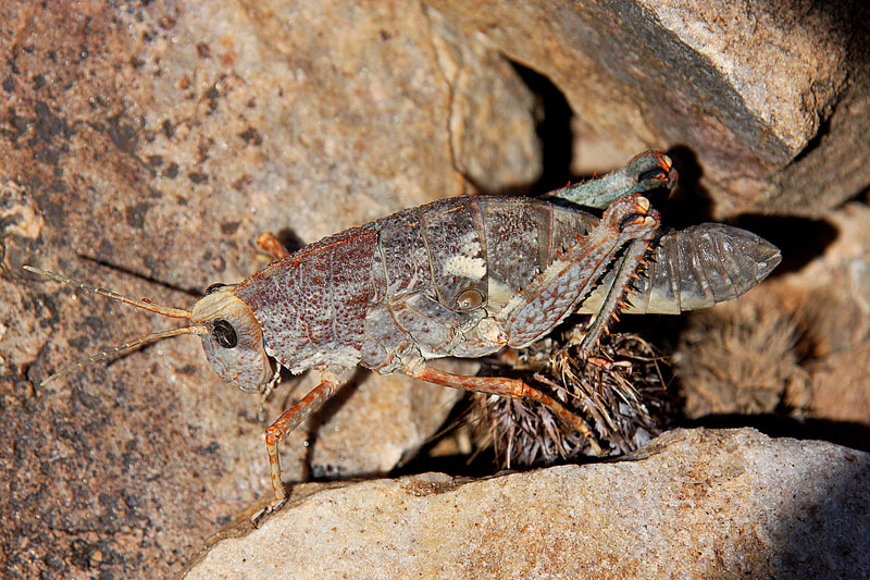 Die Sonne scheint mittlerweile mit von dünnen Schleierwolken gebremster, aber umso tückischerer Kraft vom Himmel, wärmt uns die Nacken, die Herzen, lässt die Steinschlucht zu unseren Füßen in den subtilsten Farbtönen erstrahlen – und erweckt zahlreiche Insekten zu wuseligem Leben. Unsere altbekannten Freunde, die Sattelschrecken, staksen auf ihren stacheligen Roboterbeinen um uns herum, aber auch mehrere Arten einiger kleinerer Schrecken, die man so richtig nur bemerkt, wenn sie sich bewegen. Sie haben nämlich exakt die selbe Farbe und Maserung wie das Gestein unter ihnen und sind somit extrem gut getarnt. In meinem Insektenführer kann ich sie leider nicht finden, diese Mimese-Experten, aber das ist egal; ich taufe sie einfach Felsschrecken und mache mir einen Spaß daraus, sie auf dem Gelände unseres Rastplatzes aufzuspüren, was gar nicht so leicht ist, jedoch ungeheuer Spaß macht und fast etwas von „Suchbild“ an sich hat. Plötzlich erspähe ich im Zuge dieser Jagd ein besonders stattliches Exemplar, das sich scheu in eine kleine Felsspalte drängt und wahrscheinlich inständig betet, nicht von mir entdeckt zu werden. Doch da hofft es vergeblich; ich lasse mich auf alle Viere herab und rücke der schüchternen Schrecke auf den Panzer. Ängstlich presst sie sich in die Spalte, nach einer geraumen Weile aber traut sie sich wieder heraus und präsentiert sich in voller Pracht: der steingraue Körper wird vorne von vier rostroten Beinen getragen und stützt sich hinten auf Sprungbeine, die von bräunlichroten Stacheln gesäumt sind, die Schenkel ziert ein gitterartiges Muster, die Kopfoberseite ist von zartem Gelb, die Augen sehen aus wie geschliffener schwarzer Marmor und den Thoraxpanzer sprenkeln zahlreiche, rote Chitinwarzen. Doch Moment mal, eine dieser Warzen bewegt sich – über den Rücken der Schrecke hinweg, hinauf auf zum rechten Fühler und bleibt da sitzen!