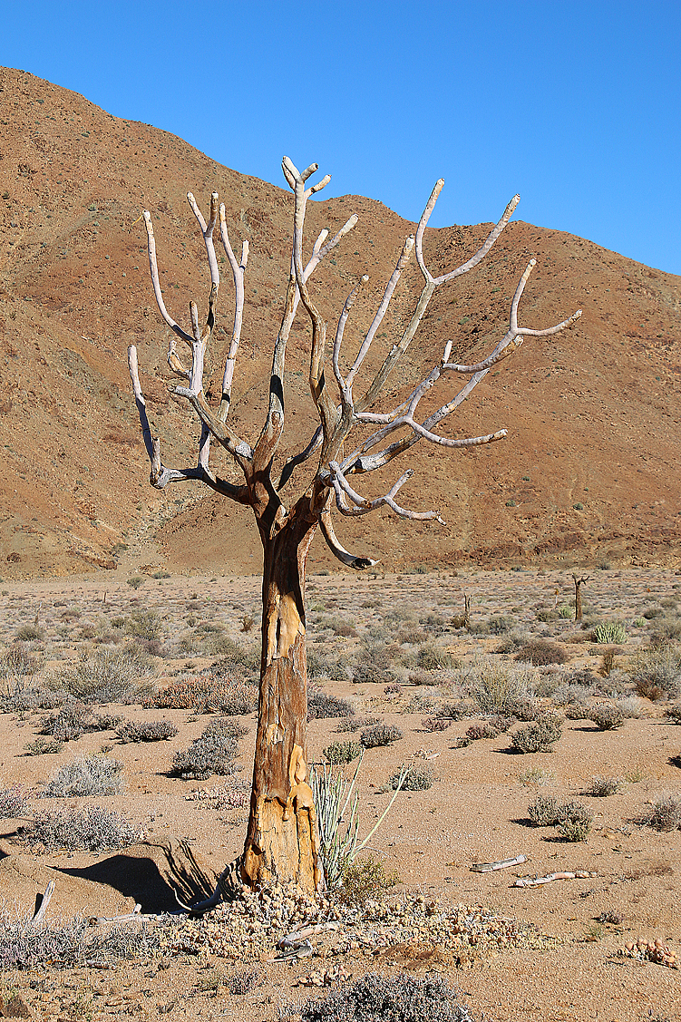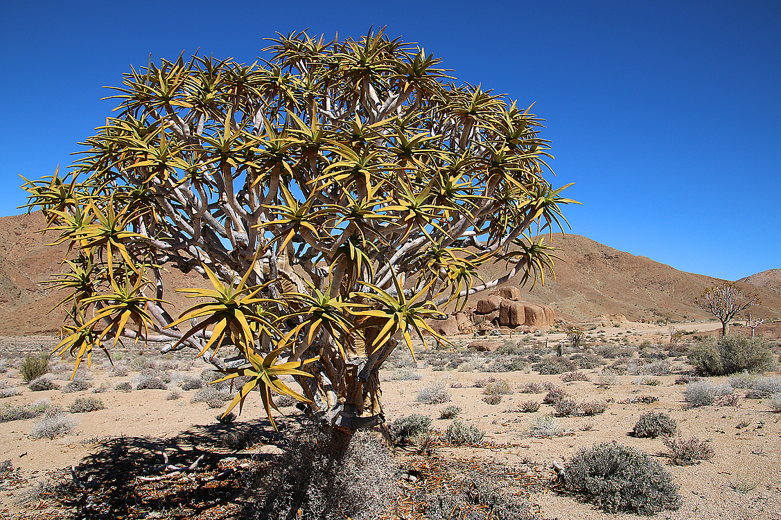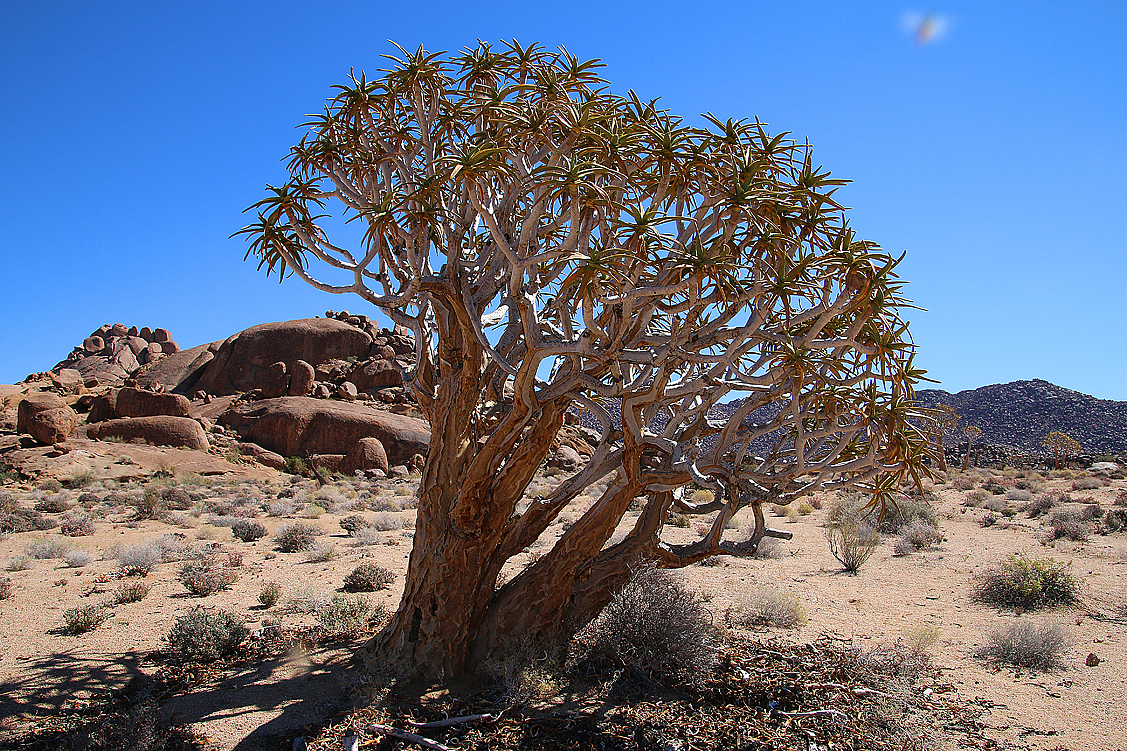 Gespannt nehmen wir die obere Zufahrt, um zu unserer gebuchten, weiter unten liegenden Campsite zu gelangen – schließlich wollen wir sehen, ob noch andere Besucher hier sind. Aber nein, wir sind ganz alleine! Yes, yes, yes, so hatten wir uns das erträumt! Und verdient haben wir es auch – nach dem Riesenrummel in De Hoop. Zufrieden lassen wir uns an unserer Campsite im wohltuenden Schatten eines haushohen Felsens nieder und genießen erst mal unser Da-Sein, die sagenhafte Aussicht auf den Kloof, die Köcherbäume und die umliegenden Berge. Einen gemütlichen Kaffee später machen wir uns dann an den Aufbau unseres Lagers, richten uns häuslich ein und ziehen danach ohne Eile los, um die Umgebung zu inspizieren. Heinz und ich schlendern auf unserer Erkundungstour entspannt zu den Köcherbäumen, die zum Großteil in einer sandigen, leicht abfallenden Ebene stehen, unsere Wildkameras im Gepäck. Auf der Suche nach geeigneten Stellen zum Befestigen der Starenkästchen, mäandern wir von einem Köcherbaum zum anderen und müssen dabei leider feststellen, dass die Population der Baumaloen noch schwerer angeschlagen ist, als wir das bei unserem letzten Besuch wahrgenommen hatten. Schon damals war uns natürlich aufgefallen, dass viele der Köcherbäume zwar noch senkrecht standen, aber längst schon ihr Leben ausgehaucht hatten. Rein fotografisch gesehen haben diese Sukkulentenleichen ja durchaus ihren Reiz: ihre bizarren Silhouetten heben sich gar malerisch vom blauen Himmel ab und verbreiten einen unglaublich anziehenden, morbiden Charme, dem man sich kaum widersetzen kann. Bei näherem Hinsehen jedoch ist die Situation erschreckend – gut zwei Drittel der Aloen sind bereits tot, viele noch lebende zeigen deutliche Anzeichen einer Erkrankung und Jungpflanzen sind nirgendwo zu entdecken.