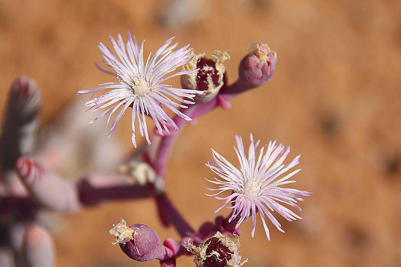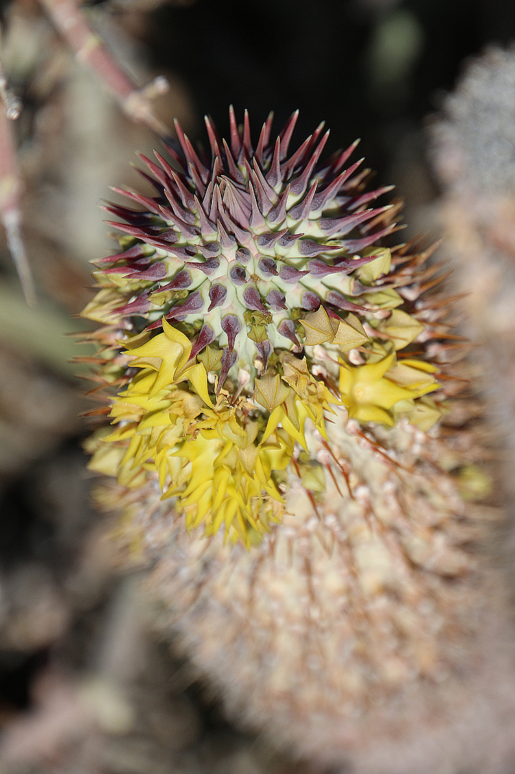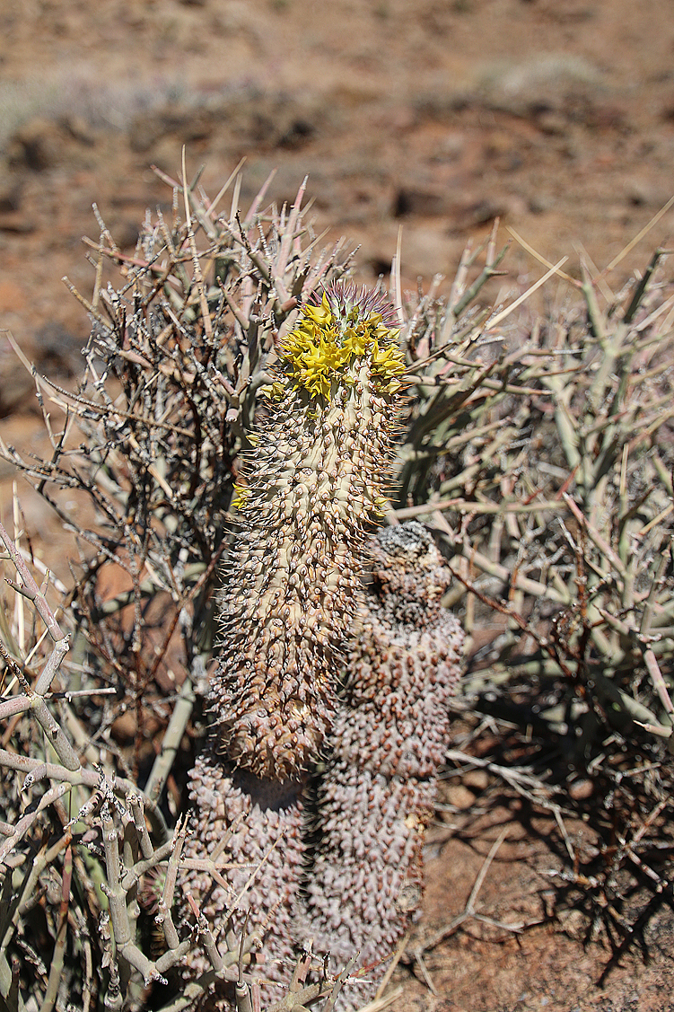 Vom Touri-Rummel befreit, zockeln wir also glücklich durch die nunmehr menschenleere Gegend und genießen alles, was sich uns darbietet. Und das sind zum größten Teil spektakuläre Landschaften, wie sie für das Richtersveld typisch sind: schroffe Felsformationen in unglaublichen Farben, auffällig gefärbte Sedimentschichten, die sich schwungvoll durch bröckelige Hügel schlängeln, sandige Trockenflusstäler, umgeben von steilen Hügeln, extraterrestrisch anmutende Mondlandschaften, und über all dem erstreckt sich ein strahlendblauer Himmel, in dem sich gar malerische Schäfchenwolken tummeln. Natürlich fahren wir auch an vielen interessanten Pflanzen vorbei, doch Heinz und ich halten uns heute mit unseren Stopp-Bitten etwas zurück, schließlich wollen wir unsere Freunde an diesem Umzugstag nicht über Gebühr strapazieren oder gar langweilen. Plötzlich aber flutscht etwas an meinem rechten Augenwinkel vorbei – nur ganz kurz, aber umso aufregender: da war eine blühende Hoodia, aber keine relativ häufig zu sehende „Gordonii“, sondern eine „Alstonii“! Wirklich? „Stopp, stopp, anhalten, bitte!“, schreie ich, überzeugt, tatsächlich eine Hoodia alstonii erspäht zu haben, gleichzeitig aber voller Zweifel, ob ich mir das nicht eingebildet habe. Jochen bremst folgsam und setzt zurück. „Noch a bissi, weiter, langsam, stopp!“, dirigiere ich ihn, total gespannt, ob mich meine Augen nicht doch getrogen haben. Haben sie nicht! Da stehen sie, mehrere, im oberen Drittel über und über von gelben, sternförmigen Blüten bedeckte Stachelwürste! Meine allererste, unsere allererste Hoodia alstonii in voller Blüte! Freudig erregt stürmen Heinz und ich aus dem Auto und umrunden ehrfürchtig das Aasblumengewächs. Unsere Mitreisenden lassen sich von unserer Aufregung tatsächlich mitreißen und so inhalieren wir gemeinsam den deutlichen Aasduft, den die unschuldig aussehenden Blüten verströmen. Meine Güte, ist das ein schöner Fund – der sonnige Tag erscheint mit einem Mal noch viel strahlender! Natürlich bestaunen wir die streng riechende Pflanze lange und gebührend und fotografieren sie von allen Seiten, bevor wir uns erneut auf den Weg machen, um den Nachmittag im Kokerboomkloof genießen zu können und somit den Bedürfnissen aller Beteiligten gerecht zu werden.
