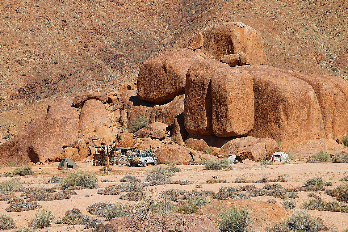 Lange jedoch fahren wir nicht, als schon das nächste Ereignis einen Stopp erfordert; der Grund allerdings ist diesmal kein so erfreulicher: Jochen lenkt den Landy ein wenig zu sportlich und eng in eine steil ansteigende Kurve. Der linke Hinterreifen gibt dabei mächtig Schub, drückt einen fussballgroßen Felsbrocken vom Fahrspurrand, unser Gefährt sackt plötzlich ab und gerät so in bedenkliche Schräglage. Erschrocken bremsen Annette und Ute, die hinter uns fahren, und eilen herbei, um unsere Karre zu stützen, während wir uns auf der rechten Seite vorsichtig ins Freie schälen. Zu viert stemmen wir uns nun mit aller Kraft gegen den Wagen und Jochen spurtet los, um geeignete Felsbrocken zur Unterfütterung des linken Hinterreifens herbeizuschleppen. Nur gut, dass loses Gestein im Richtersveld keine Mangelware ist! So ist rasch ein stabilisierendes Geröllbett aufgeschichtet und Jochen kann den Wagen unfallfrei aus der Gefahrenlage bringen. Puh, das ist ja grade nochmal gut gegangen. Erleichtert steigen wir wieder zu und denken mit leichter Gänsehaut an unsere gestrige Abfahrt vom Domorogh Pass zurück. Das hätte gerade noch gefehlt: den Domorogh geschafft, dafür aber einen Tag später an einer harmlos erscheinenden Kurve gescheitert… Doch so schnell kann’s manchmal gehen – und auch, wenn nichts passiert ist, ist uns dieses Ereignis doch mal wieder eine deutliche Mahnung, keine Pad zu unterschätzen, möge sie auch noch so ungefährlich aussehen. Entsprechend achtsam steuert Jochen nun die restliche Strecke zum Kokerboomkloof, wo wir am frühen Nachmittag tatsächlich ohne weitere Zwischenfälle eintreffen.