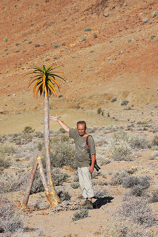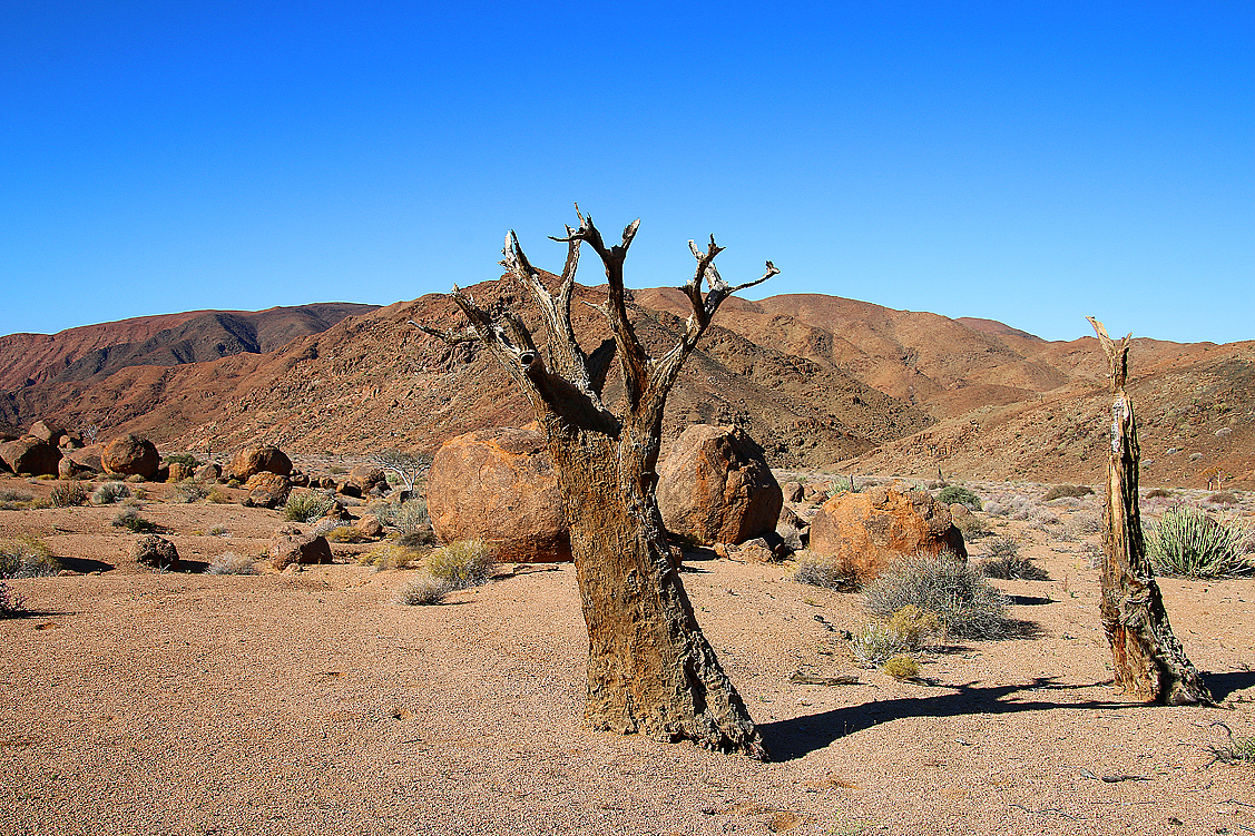 Nach unserer letztjährigen Tour hatte ich mich intensiv mit diesem Phänomen beschäftigt und alles aus dem Internet gezogen, was sich damit befasste. Das Ergebnis war ernüchternd! Zwar gibt es zahlreiche Studien zum Thema, das ja nicht allein den Kokerboomkloof betrifft, sondern vielmehr den Gesamtbestand der Aloen in Südafrika und Namibia, doch ein schlüssiges Resultat konnte keine präsentieren. Obwohl alle Studien ausnahmslos die selben Faktoren abcheckten, unter anderem Wildverbiss, Pilzerkrankungen und klimatische Veränderungen – ja, sogar so abstruse mögliche Gründe wie Populationsschäden durch Pflanzensammler waren dabei – konnte keine beweisbare Ursache für das Sterben der Köcherbäume gefunden werden. Der Großteil der Studien jedoch schoss sich auf das Klima ein – in zwei Varianten, die in ihrem streng wissenschaftlichen Rahmen erstaunlich weit auseinanderdriften: zwei Drittel behaupten, es wäre die globale Klimaerwärmung, die den Köcherbäumen das Leben kostet. Allerdings, und das macht die ganze Angelegenheit wenig vertrauenerweckend, klafft hier eine Lücke von sage und schreibe 1,2 Grad Celsius. Vorsichtige Studien sprechen nämlich von um 0,6 Grad gestiegenen Durchschnittstemperaturen während der letzten sechs Jahrzehnte, keckere hingegen stellen satte 1,8 Grad in den Raum! Eine echte Hausnummer! Bei einem lauschig-warmen Abend im Biergarten spielen 1,2 Grad mehr oder weniger wohl kaum eine Rolle, umso mehr aber, wenn es sich um eine durchschnittliche Temperatursteigerung während weniger Jahrzehnte handelt!